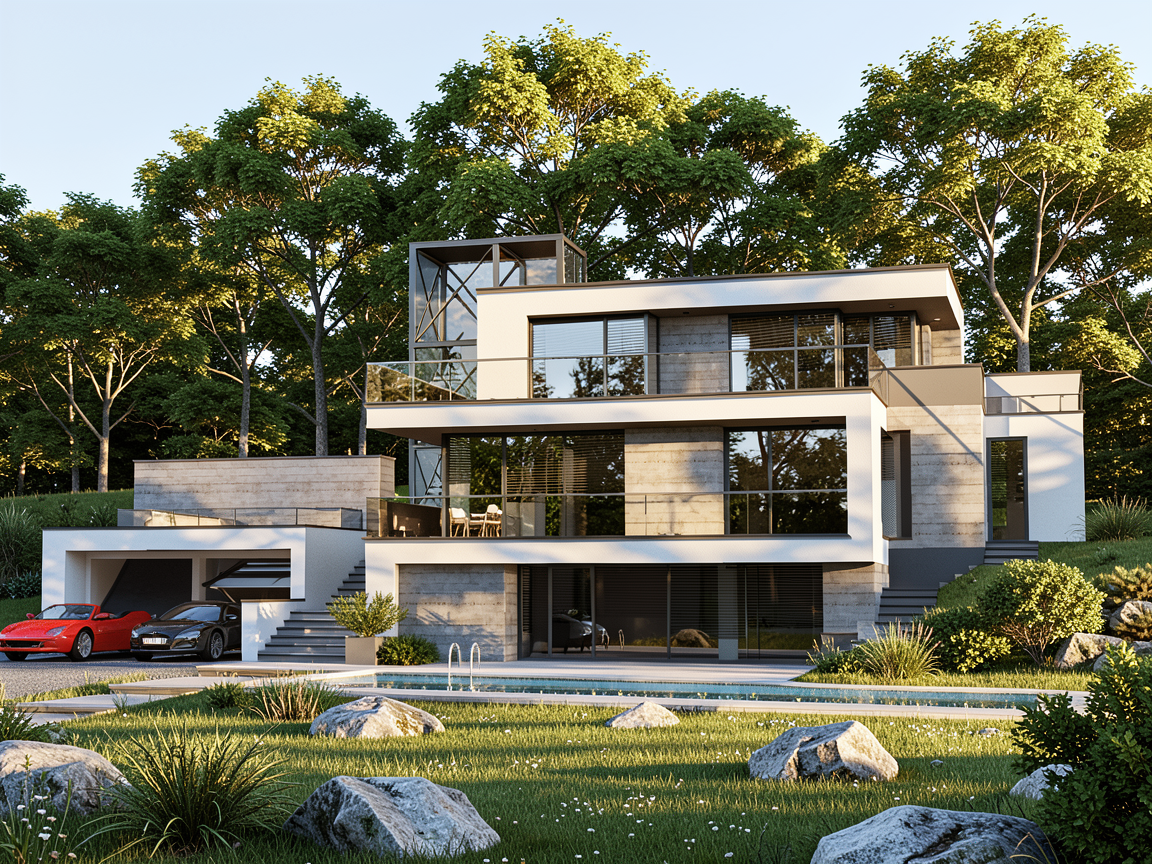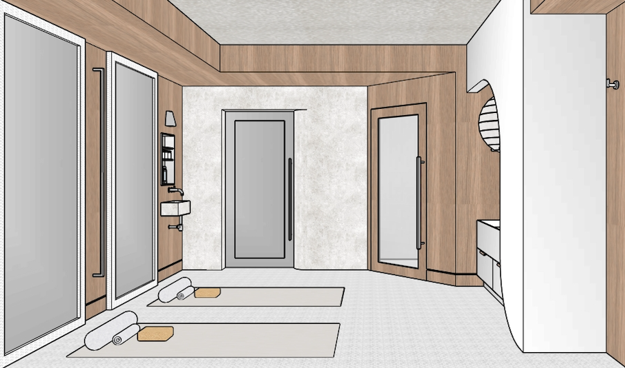make realistic with no natural light all lighting should be coming from sconces and cove led lighting the framed items on the left are mirrors the white storage wall on the right is stainless steel material same with the built in drawers door in the center is stainless steel