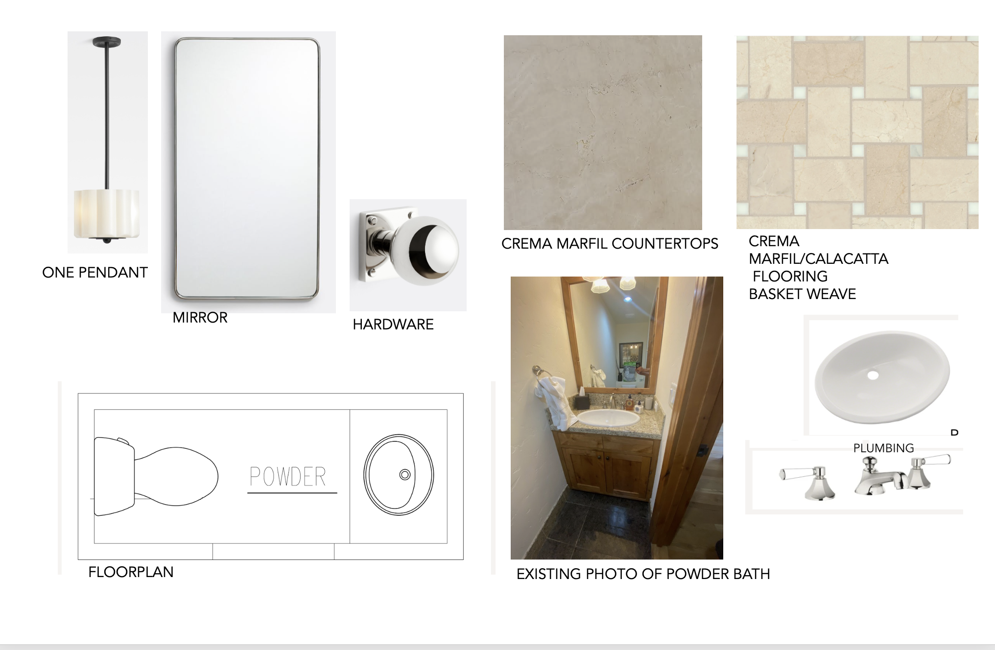 photorealistic interior render of a small powder bathroom renovation based on the provided floor plan and existing vanity photo existing to remain keep the current knotty alder vanity cabinetry with warm natural wood tone and visible grain maintain overall vanity size and proportions as shown in reference photo updates materials countertops crema marfil marble polished finish soft warm cream tone with subtle veining flooring marble basket weave pattern crema marfil with calacatta accents as shown in reference image walls benjamin moore swiss coffee warm soft white mirror simple rectangular mirror with thin metal frame lighting replace existing wall sconce with a single pendant light mounted on the left side of the mirror plumbing hardware polished nickel fixtures with classic silhouettes layout scale follow the provided floor plan vanity centered on wall with toilet adjacent as shown accurate scale and clear circulation lighting mood bright warm and inviting even ambient lighting to make the small space feel open and elevated no harsh shadows warm light temperature approx 3000k style atmosphere timeless refined and understated elevated powder bath with a warm european inspired feel clean calm and client ready camera composition straight on vanity elevation plus a slight angled view to show flooring and pendant placement true to life proportions rendering quality ultra realistic materials accurate marble veining soft reflections editorial quality realism avoid cool or gray lighting modern minimalism overly dramatic contrast or stylized cartoon rendering