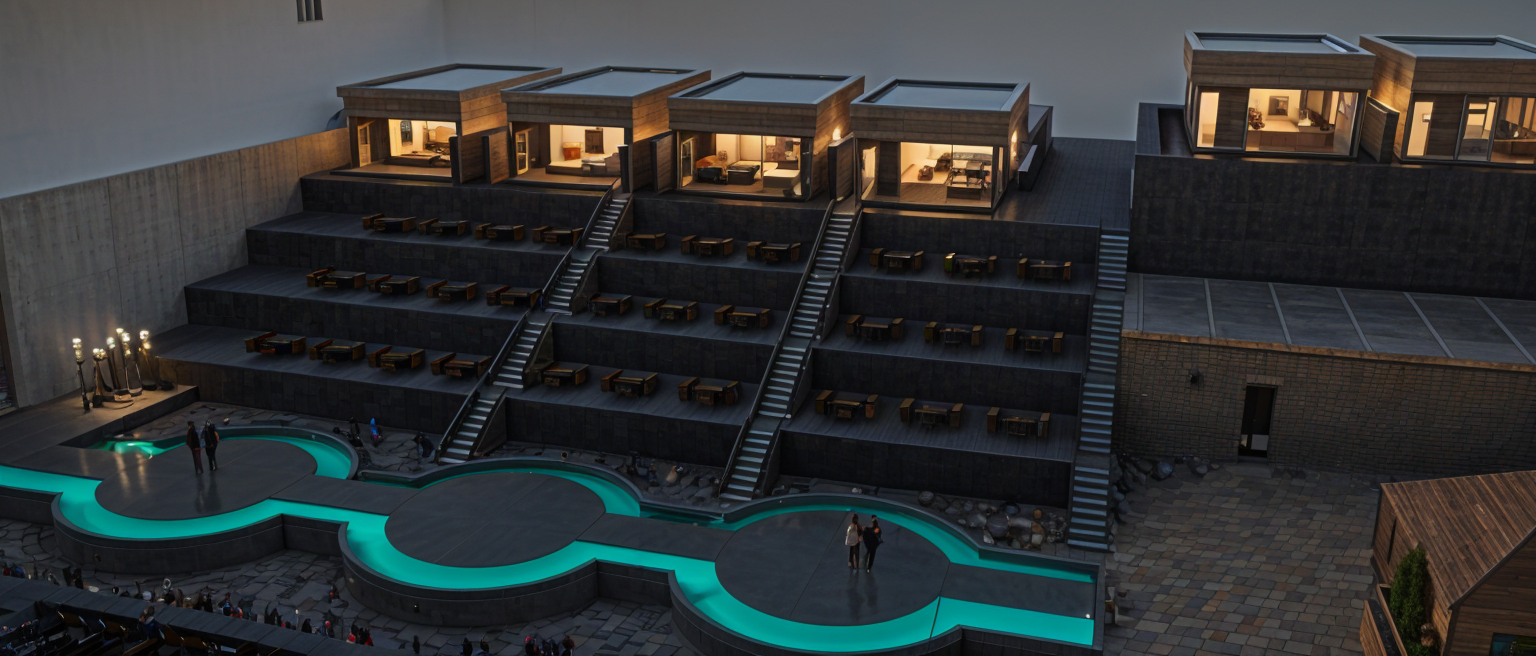 exterior shot retain exact geometry with hole and beams in middle of building