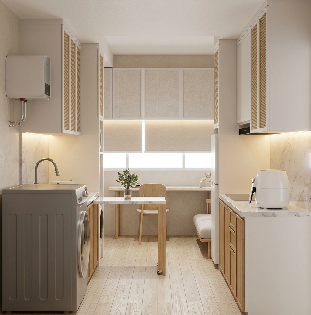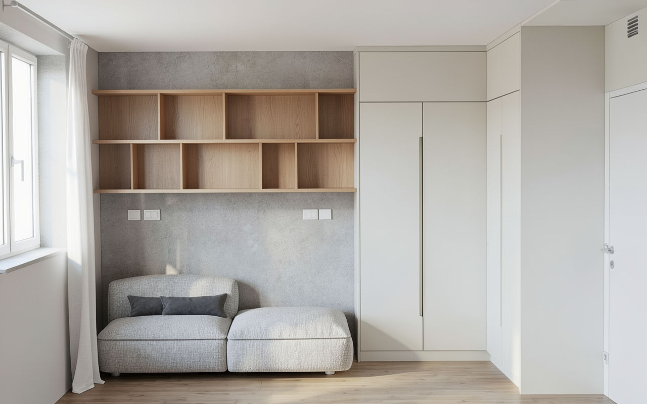 use the provided screenshot strictly as the base image do not change the camera angle perspective room geometry layout furniture placement or proportions preserve the exact composition of the reference image do not add new furniture or change the architecture only improve materials lighting colors and realism create a highly realistic interior render of a calm modern minimal bedroom corner furniture and materials must follow the reference exactly the sofa is a light grey upholstered sofa with soft rounded edges and visible fabric texture the upholstery should look like woven textile with subtle structure place two darker grey cushions on the sofa as in the reference the wall behind the sofa is finished with concrete plaster betonov st rka the surface should have a fine mineral texture with soft tonal variation and a natural matte finish above the sofa there are floating wall shelves made from natural oak wood the oak should have a subtle calm grain with a soft radial pattern not strongly contrasted the floor is natural oak wooden flooring with a matte finish and soft natural grain on the right side there are tall built in cabinets in a chalk colored matte finish soft off white chalk tone the surface should be smooth and minimal the curtain near the window is white fabric light and slightly translucent with natural folds the door on the right side is clean bright white with a smooth painted surface lighting use soft natural daylight entering from the window on the left side the light should create a calm atmosphere with soft shadows and realistic reflections on the wood floor and cabinets style photorealistic interior visualization modern minimal design scandinavian aesthetic soft daylight realistic materials high detail textures
