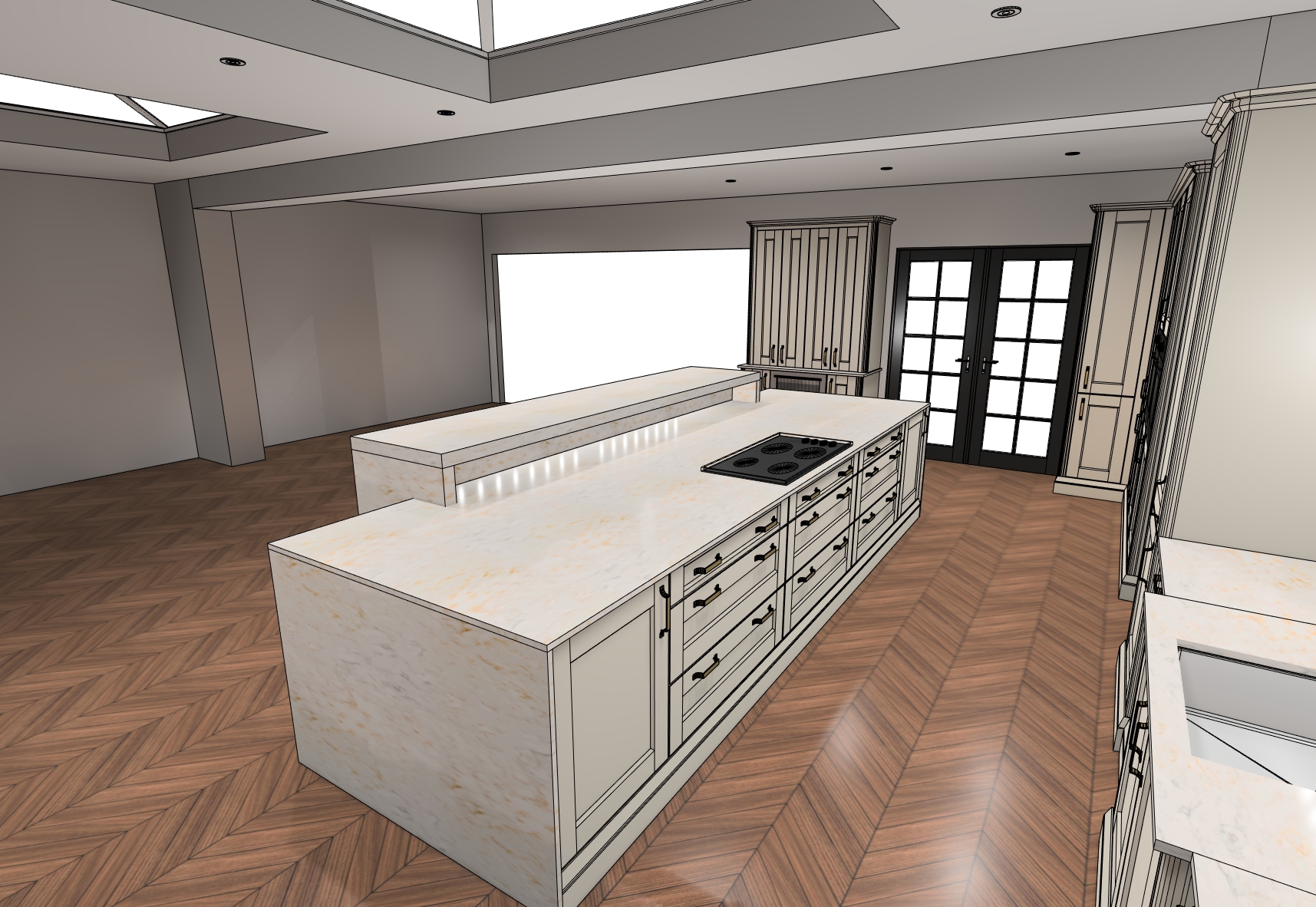 create photorealistic image of the kitchen with warm white cabinets a marble effect worksurface which runs onto end panels on island unit add minimal kitchen accesories onto surfaces change bar stools to beige fabric with round backs and set out some champagne flowers and glasses on breakfast bar add a table and chairs sofa in centre of room and tv on far wall