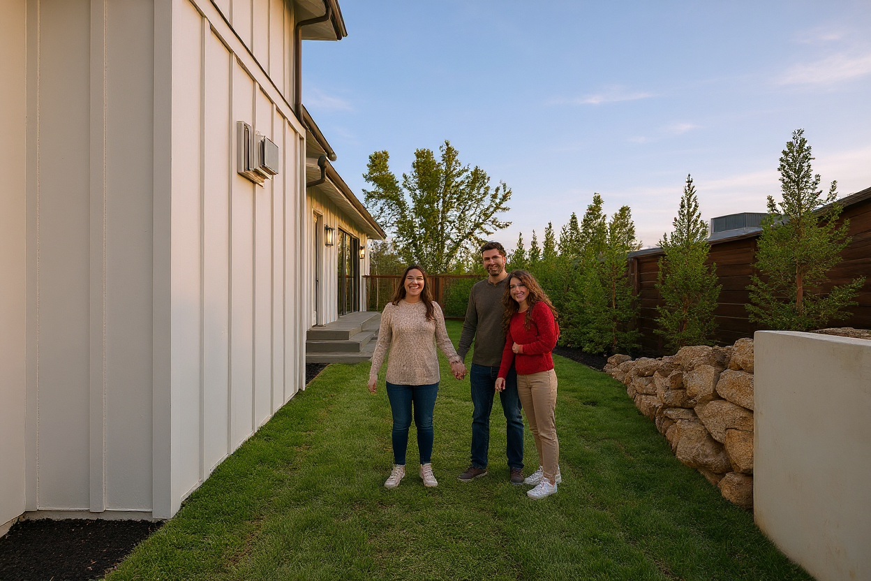 light gray standing seam metal roof white wood shake siding white wood railings white wood columns black door and window frames wood deck tropical backdrop