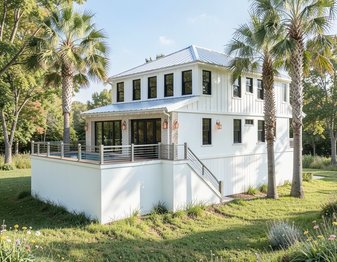 a luxury tropical coastal residence with a clean white exterior and a sleek silver standing seam metal roof the architecture blends modern coastal elegance with subtle southern influences the fa ade features black framed windows that contrast sharply against the white walls at the main entrance install warm copper gas lanterns symmetrically mounted on either side of the front door creating a refined inviting focal point structural columns are made of tabby concrete embedded with visible oyster shells adding texture and coastal character between the columns incorporate elegant louvers for ventilation and visual rhythm surround the home with thoughtfully placed palm trees that frame the structure without obstructing key sightlines landscaping should feel curated and minimal less dense foliage with clean spacing to reveal more of the architecture and a visibly larger backyard at the rear design an elevated pool integrated into the back deck appearing seamless with the outdoor living space deck railings should be modern using either cable or horizontal metal bars to maintain unobstructed views include subtle high end outdoor furniture on the patio arranged naturally and proportionally lighting should be bright mid day sun with crisp shadows and a warm tropical atmosphere the overall composition should emphasize openness clean lines and a balance between architecture and landscape