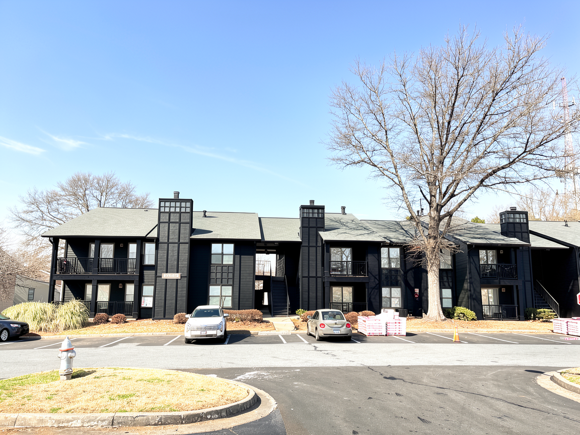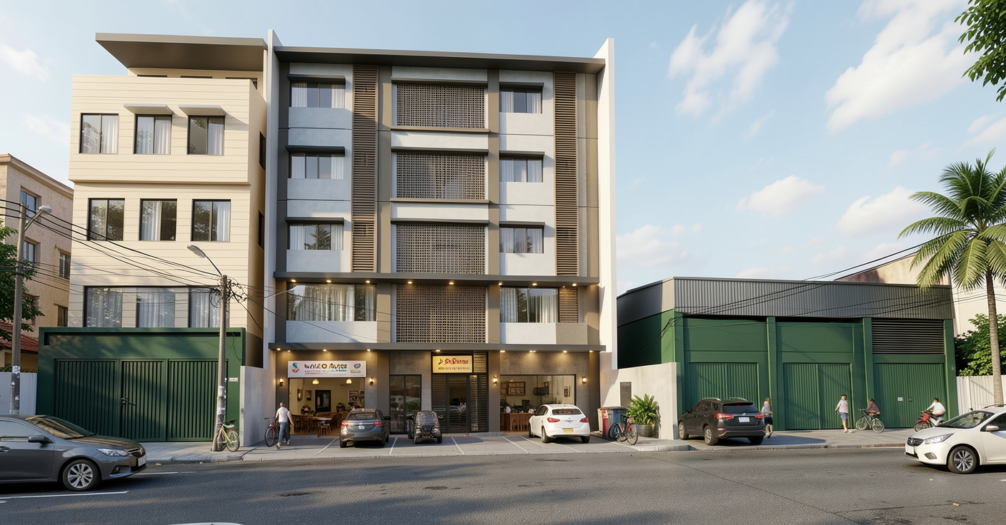 render a modern urban building complex featuring three distinct sections the left section is a three story building with a soft sandy beige facade complemented by large rectangular windows framed in dark gray the central section stands tall with a sleek contemporary design showcasing light gray concrete walls interspersed with vertical wooden slats in a warm chestnut tone the windows here are large and tinted providing a reflective surface the right section is a single story structure with deep emerald green walls creating a striking contrast the ground is paved with smooth gray concrete adding an industrial feel the atmosphere is lively yet relaxed with a clear sky casting natural daylight across the scene