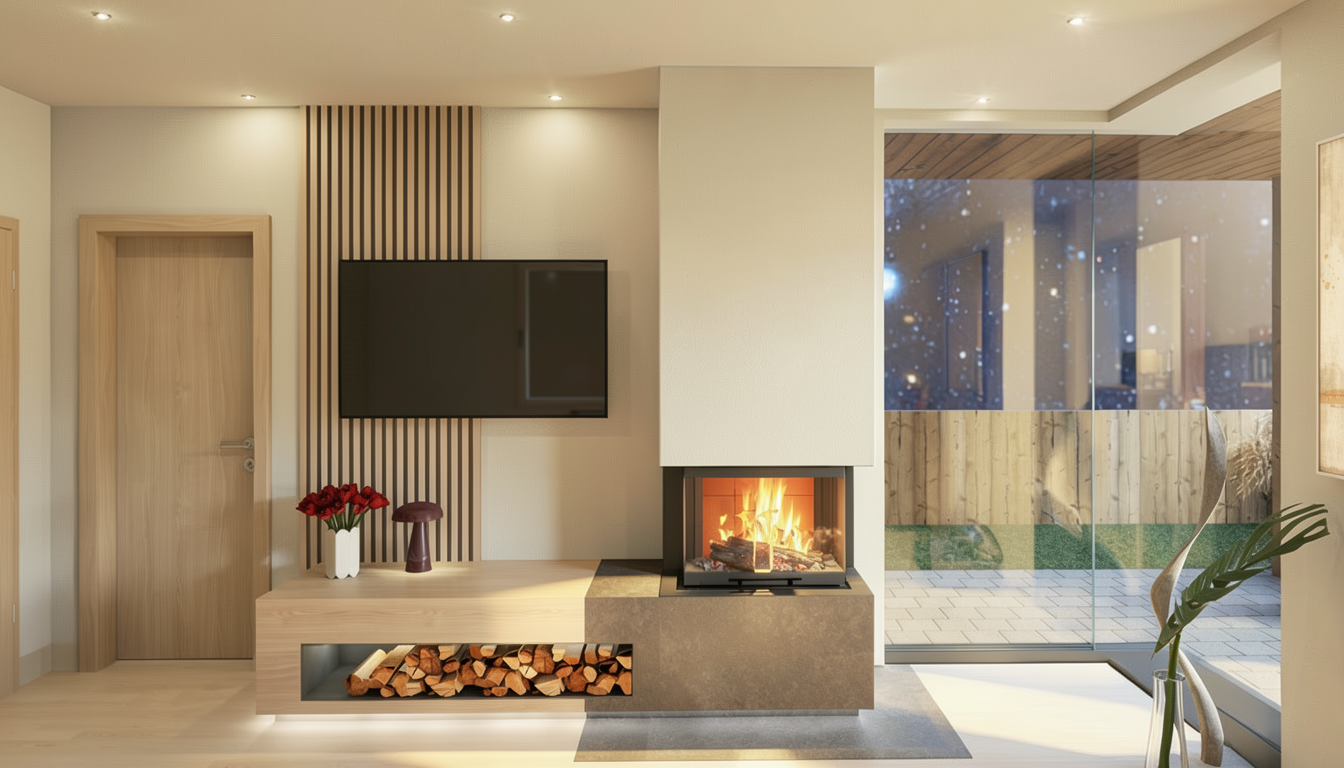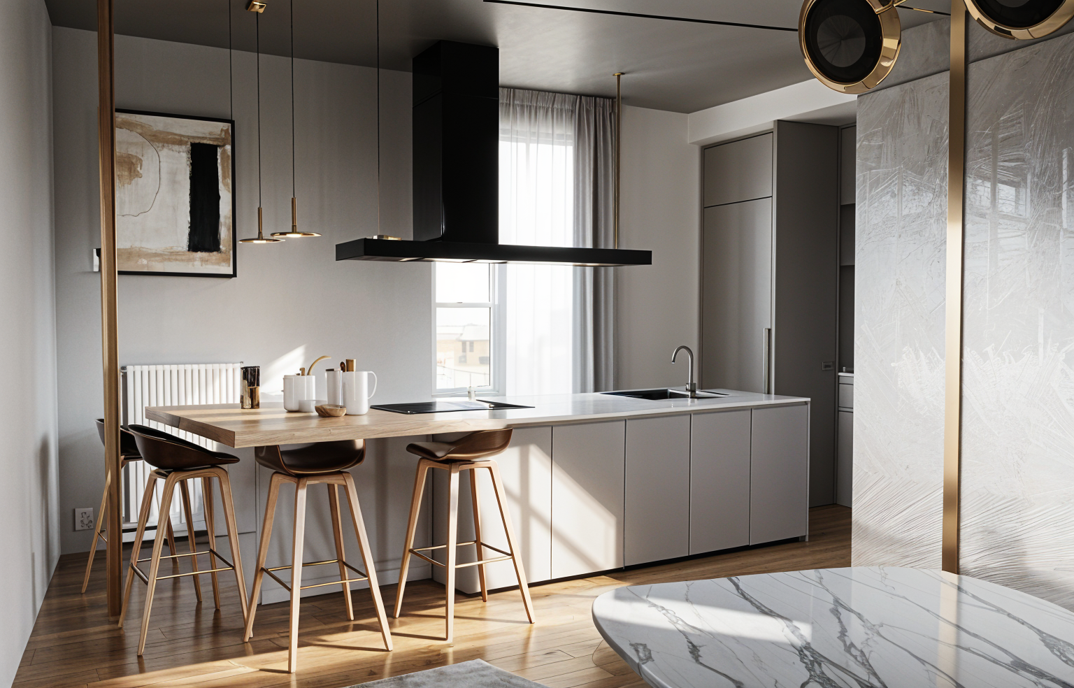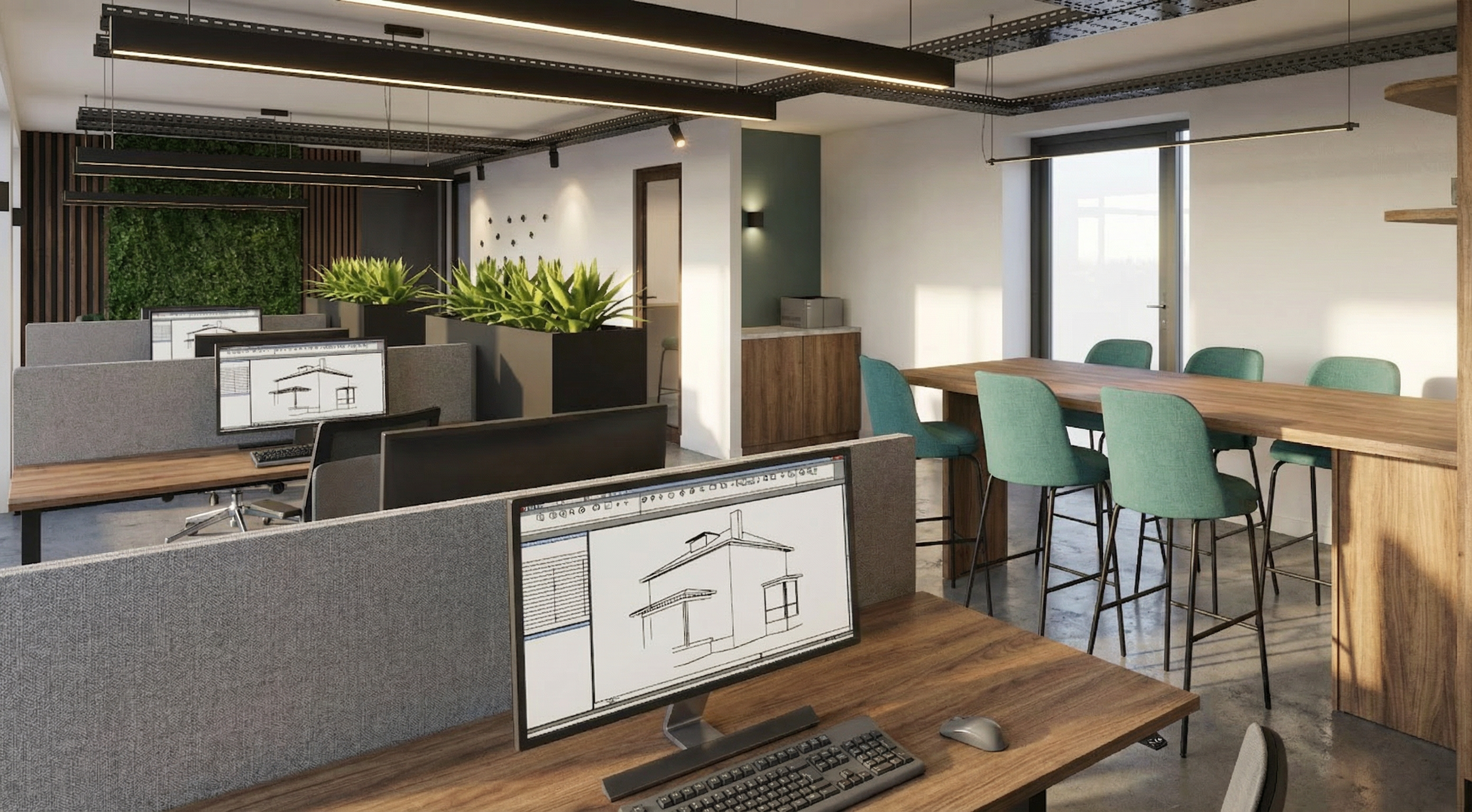 use the provided cad perspective strictly as the sole geometric and compositional reference preserve all elements exactly as given including proportions layout camera position field of view and object placement do not add remove reinterpret or redesign any architectural or interior elements no new objects furniture or light sources may be introduced under any circumstances all visible text within the image must be preserved exactly as shown do not alter reinterpret stylize translate or replace any text typography spelling layout and positioning must remain 100 identical to the original enhance the image exclusively through photorealistic rendering quality apply realistic materiality to all surfaces based on their implied function and construction maintaining the original design intent surfaces should exhibit subtle physical properties such as texture depth light absorption soft reflections and where appropriate controlled specular highlights or mirror effects avoid exaggerated or stylized materials aim for believable natural realism lighting introduce natural daylight entering the space in a plausible and context appropriate way the daylight should appear realistic and balanced without being limited to overcast conditions detect and utilize all light fixtures that are present in the original cad image these must visibly emit light and contribute to the overall illumination of the scene artificial lighting should produce realistic light falloff gentle highlights and nuanced shadow transitions do not add or invent any additional light sources beyond those already visible in the image the final image should read as a faithful photorealistic translation of the original cad perspective not as a reinterpretation add some people they sitting round the table and are listening to a speaker