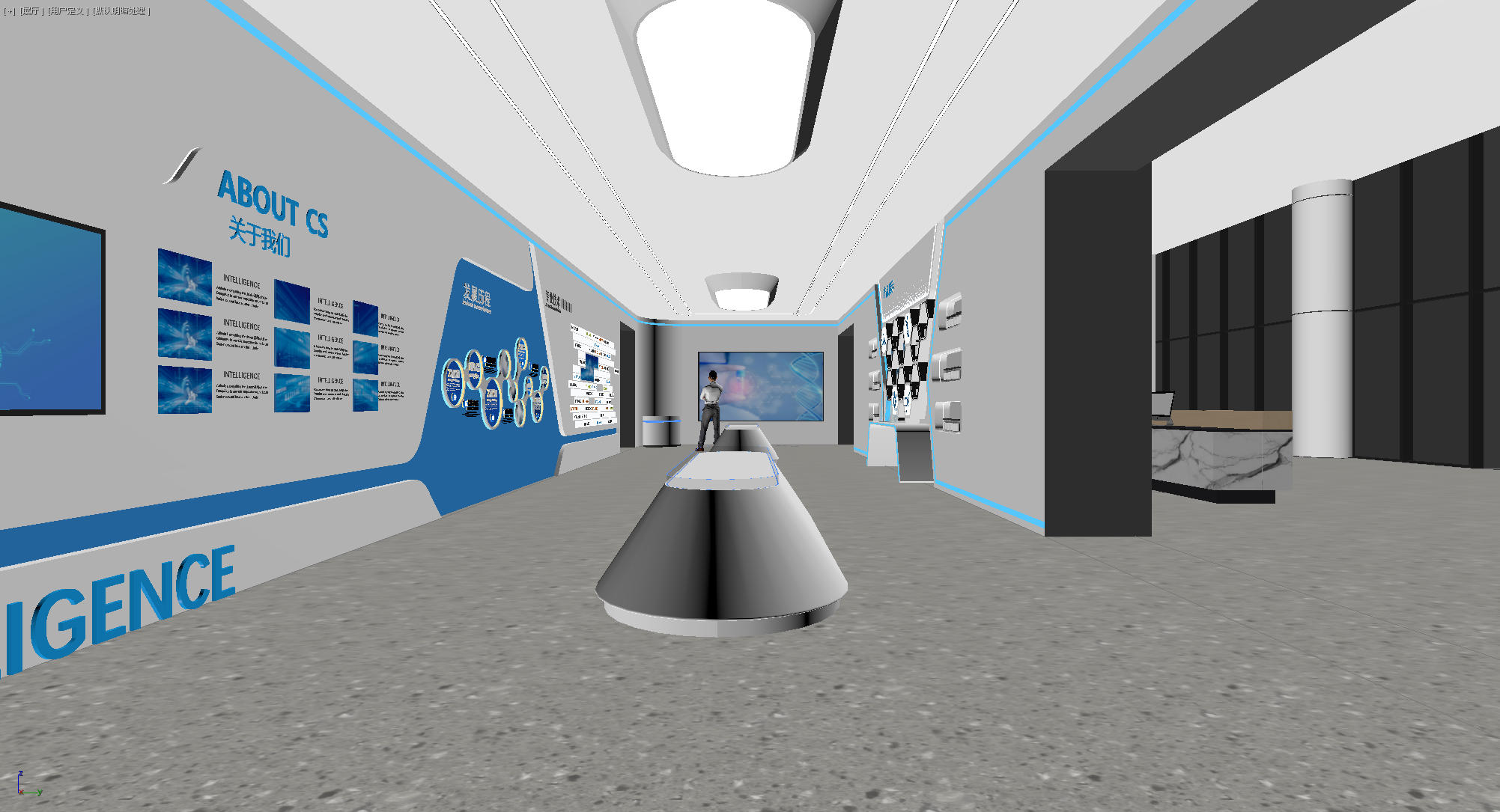 render an elegantly modern lobby interior with a polished concrete floor and sleek black window frames feature a vibrant blue textured wall with metallic silver logo text complemented by lush green plants in glossy black planters incorporate a combination of warm wooden accents and soft sage green tones in the furniture the ceiling should display an artistic array of geometric acoustic panels in white gray and blue hues bathe the space in natural light for a welcoming and sophisticated ambiance