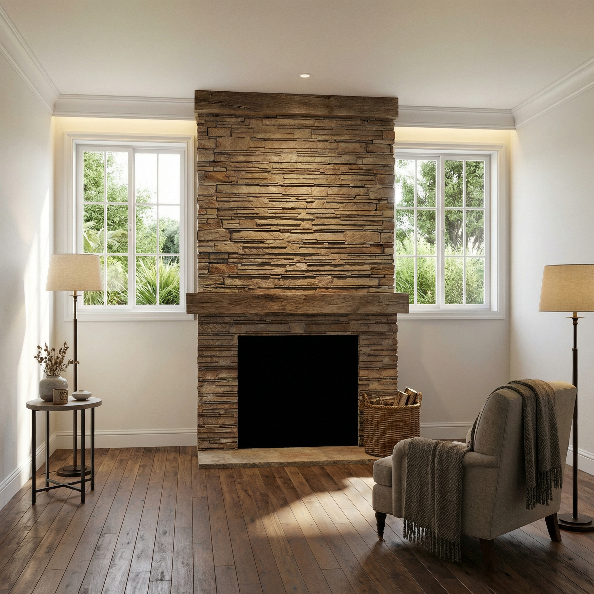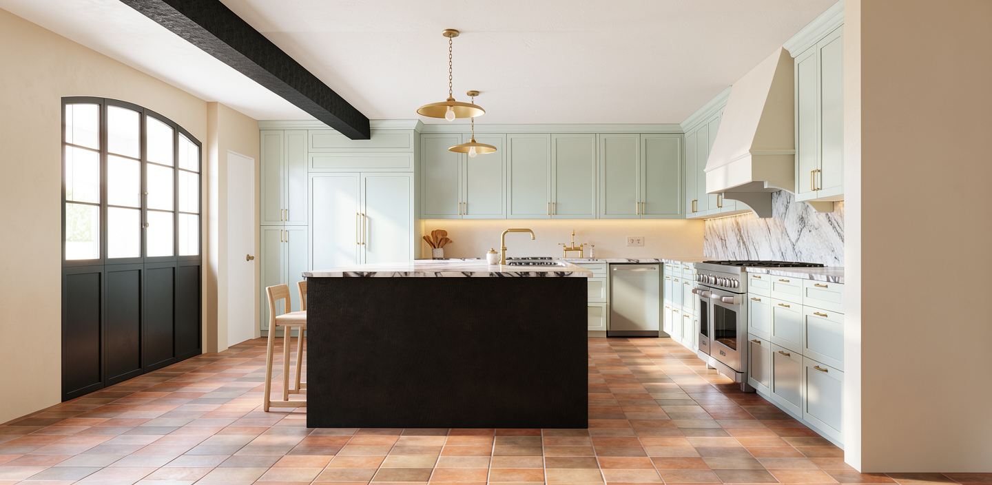 walls and door and hood vent to have a plaster finish cabinetry to have a semi gloss mushroom colored paint finish light fixtures to be white and brass ceiling beam should be dark black wood island wood should be dark brown wood