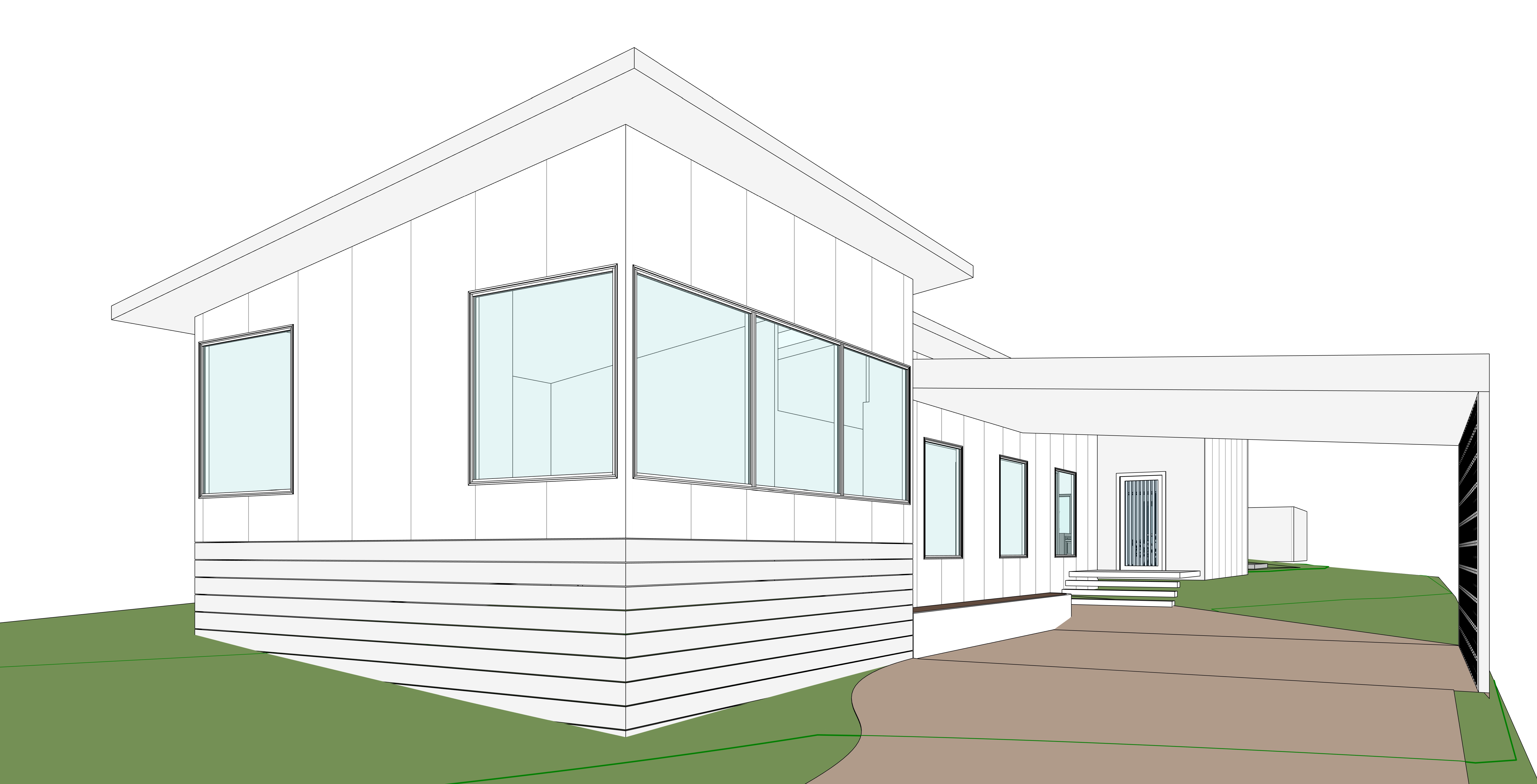 exterior shot a modern house with clean minimalist architecture featuring large glass windows the exterior is painted a crisp white with subtle gray paneling for contrast the driveway and pathway are smooth concrete with a warm beige hue surround the house with neatly trimmed green grass and plant vibrant colorful flowers along the path for added charm the atmosphere is bright and sunny with clear blue skies and soft morning light casting gentle shadows creating a serene and inviting mood