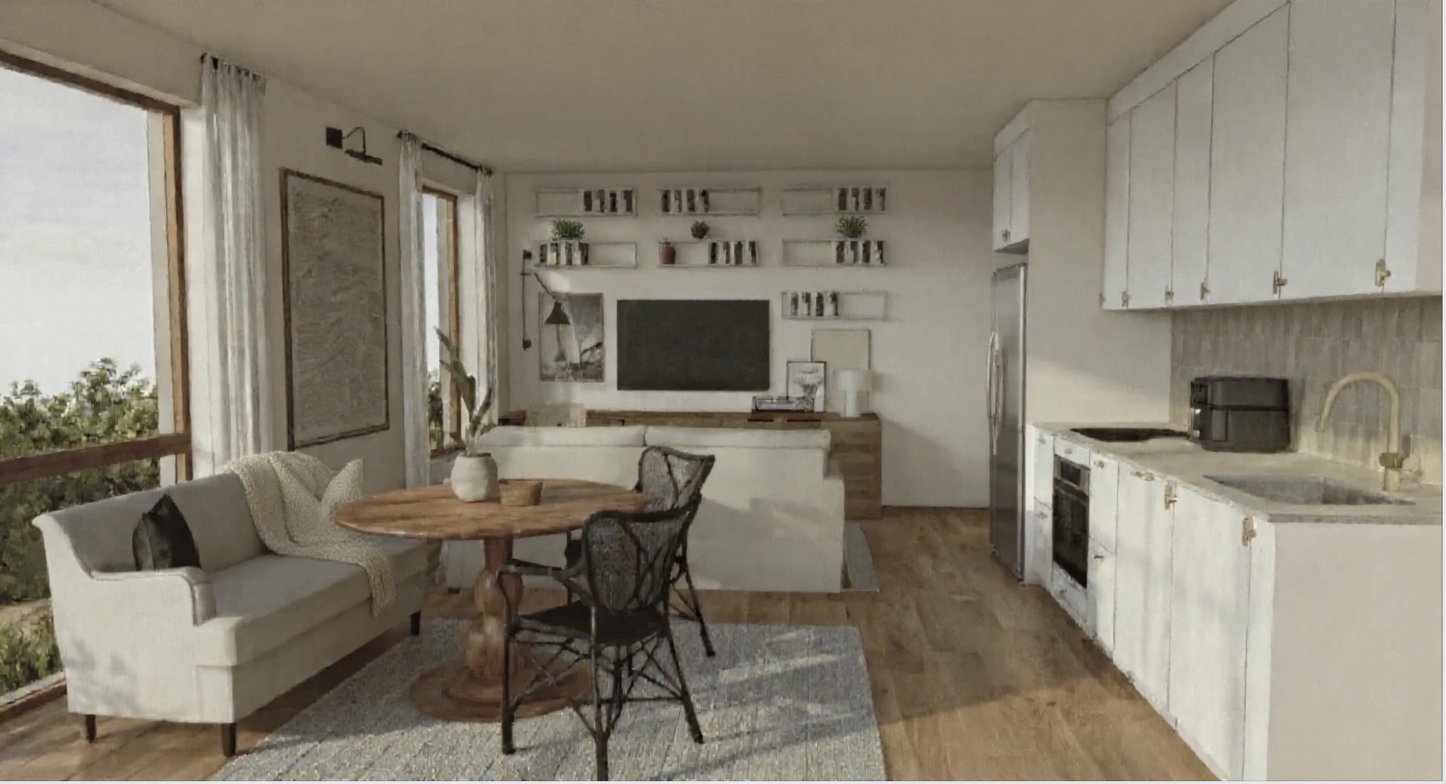 kitchen cabinets are light mat gray with gold handles room appears in warm natural daylight extend the rug under the table to extend under the sofa