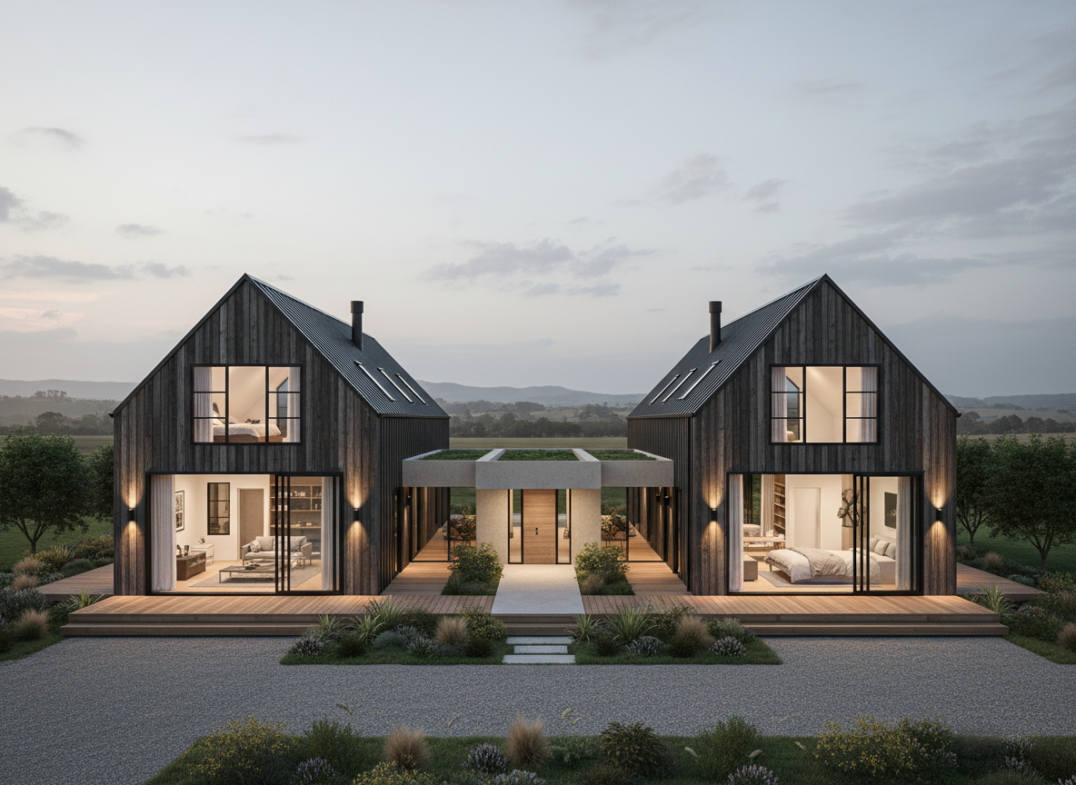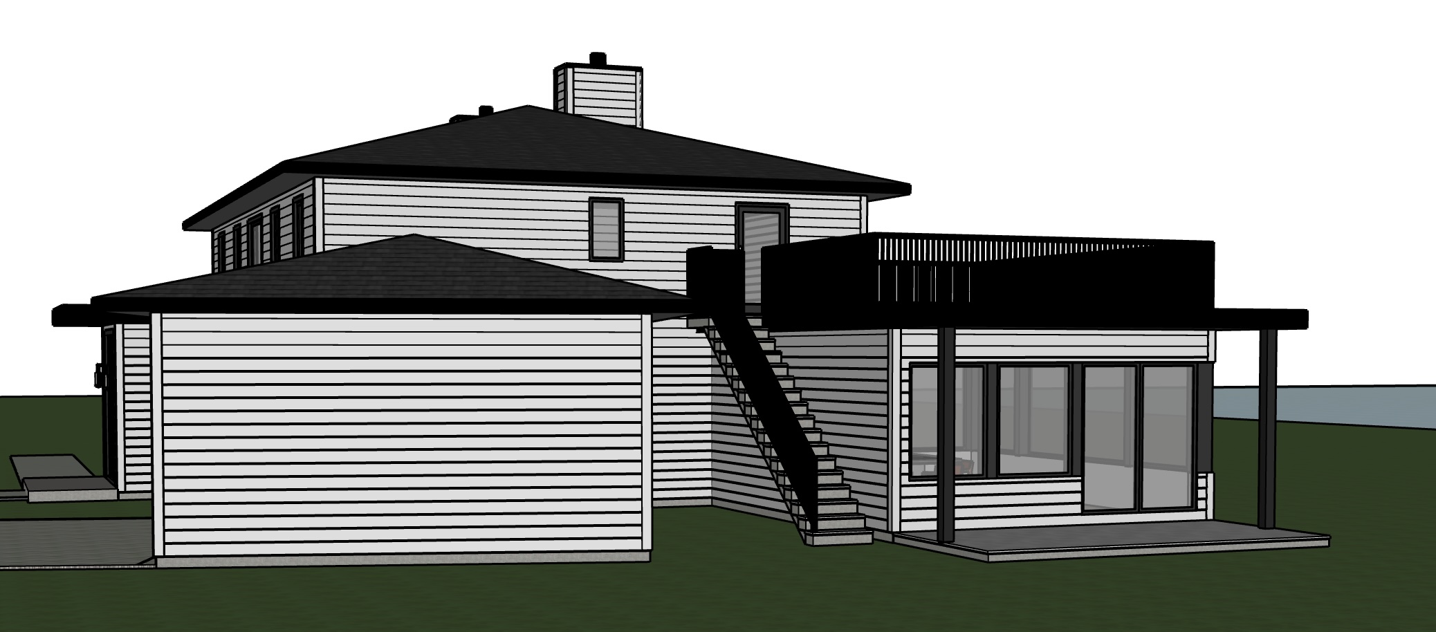 watercolour rendering no changes to architecture in image provided maintain all roof shapes roof over entry door is flat white siding for exterior roof are black window frames and doors are black add some subtle rocky landscaping more gravel less grass local to qc lake behind house in the distance do not add car keep draw way and walkways as shown