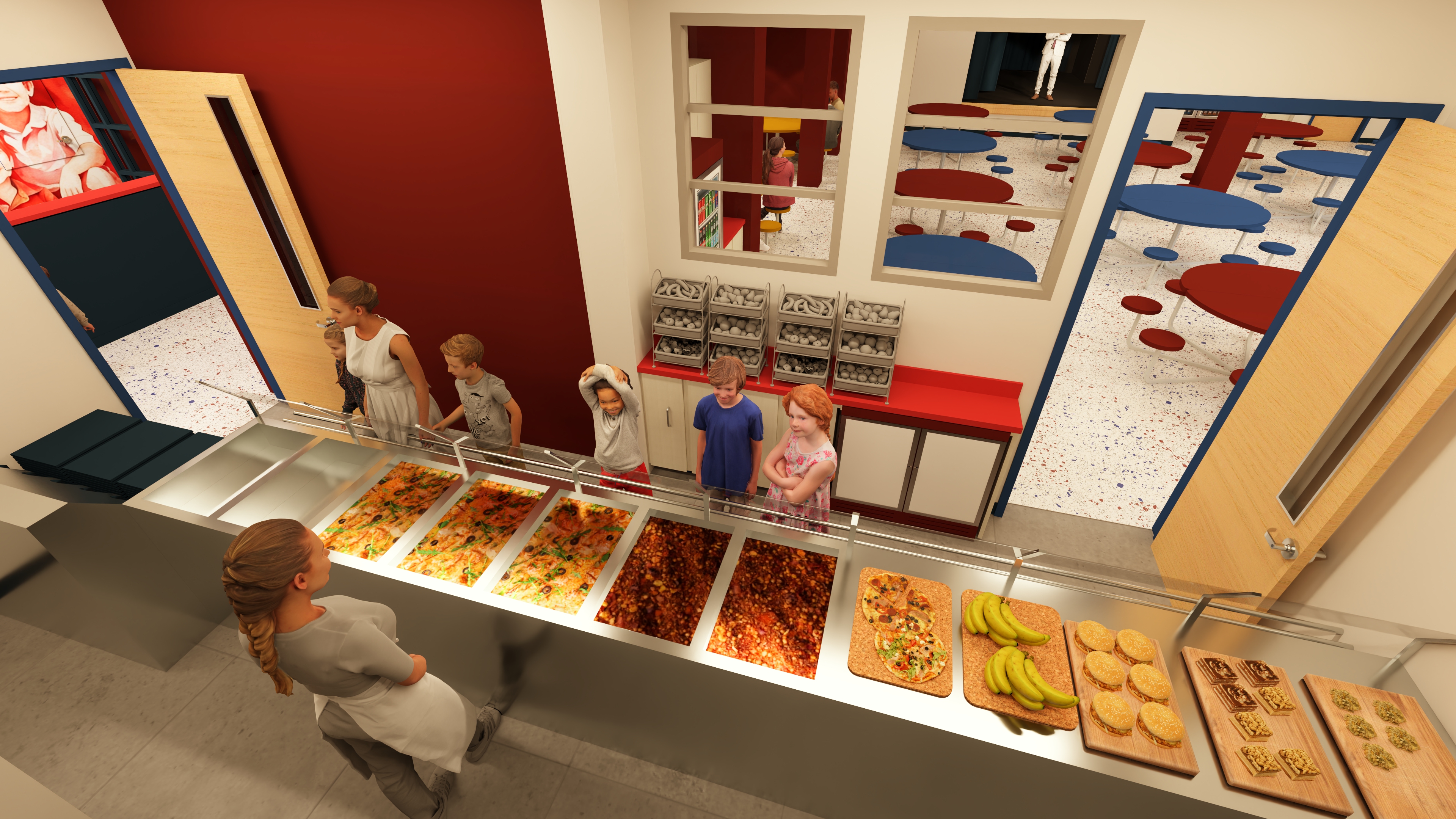 add kindergarten children in casual blue school uniform change the display on back counter to fruit display with green apples oranges pears and red apples