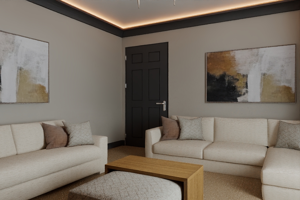 improve the lighting make the room brighter but keep the earthy tones add ttwo books with bowl on top and next to it some candles in beige add a chocolate brown throw on the right sofa