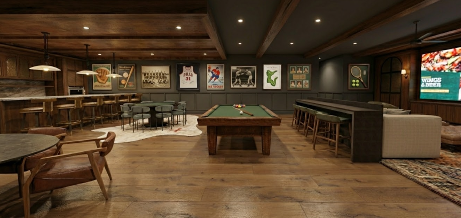 nvert this image into a photorealistic interior render while keeping the exact layout cabinetry ceiling beams wall paneling and materials the same do not redesign the space
