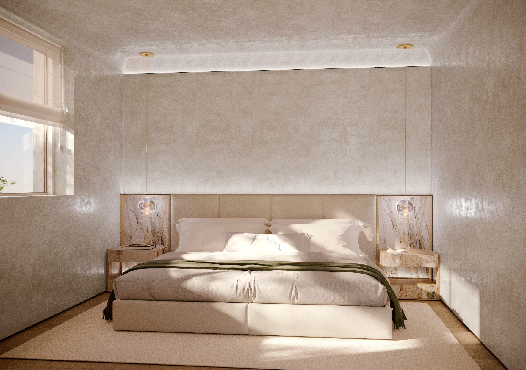 render the space in hyper realistic visualization quality at 8k resolution make the rug more realistic and in silk without that gap between rug and floor make the landscape outside more realistic