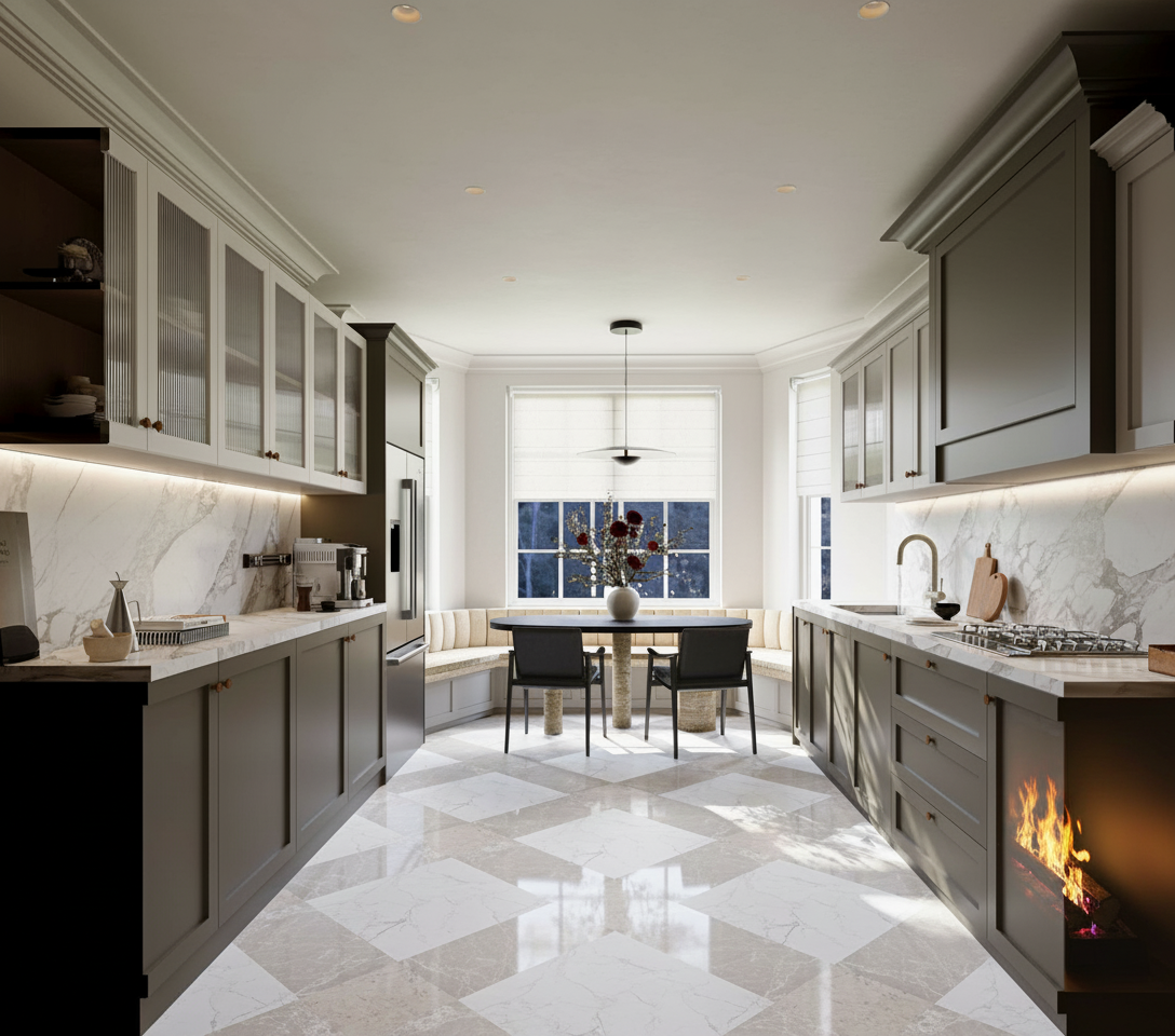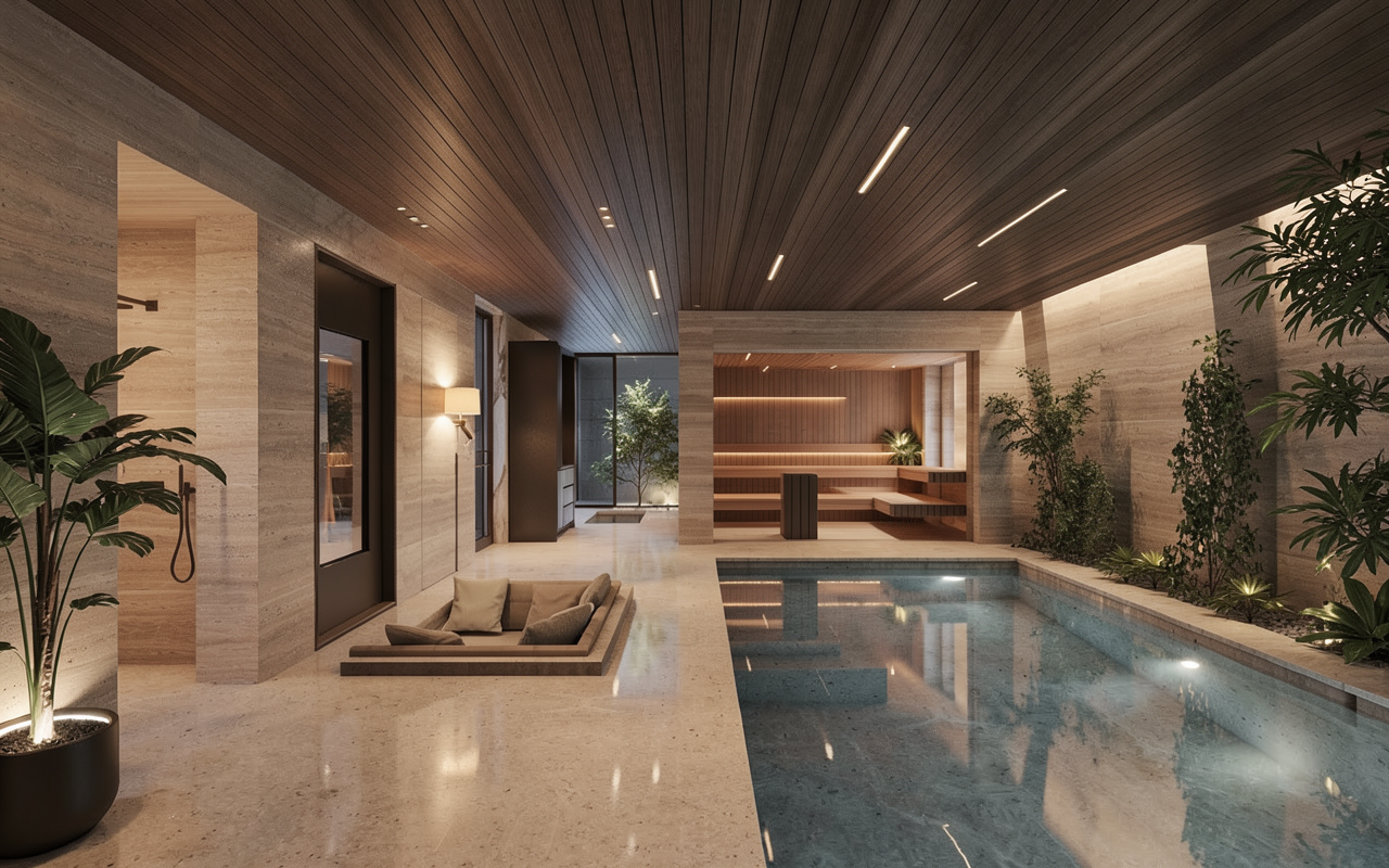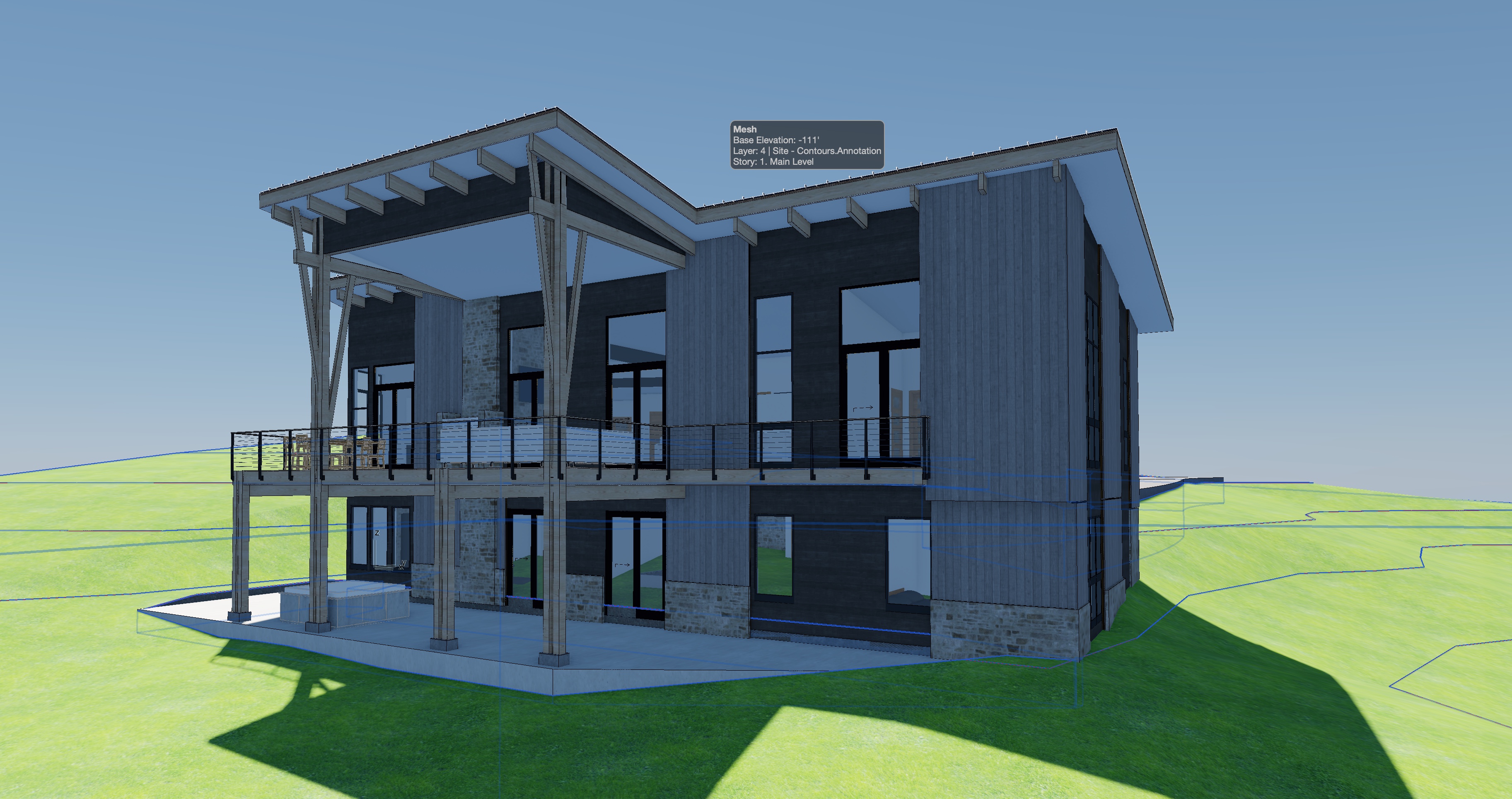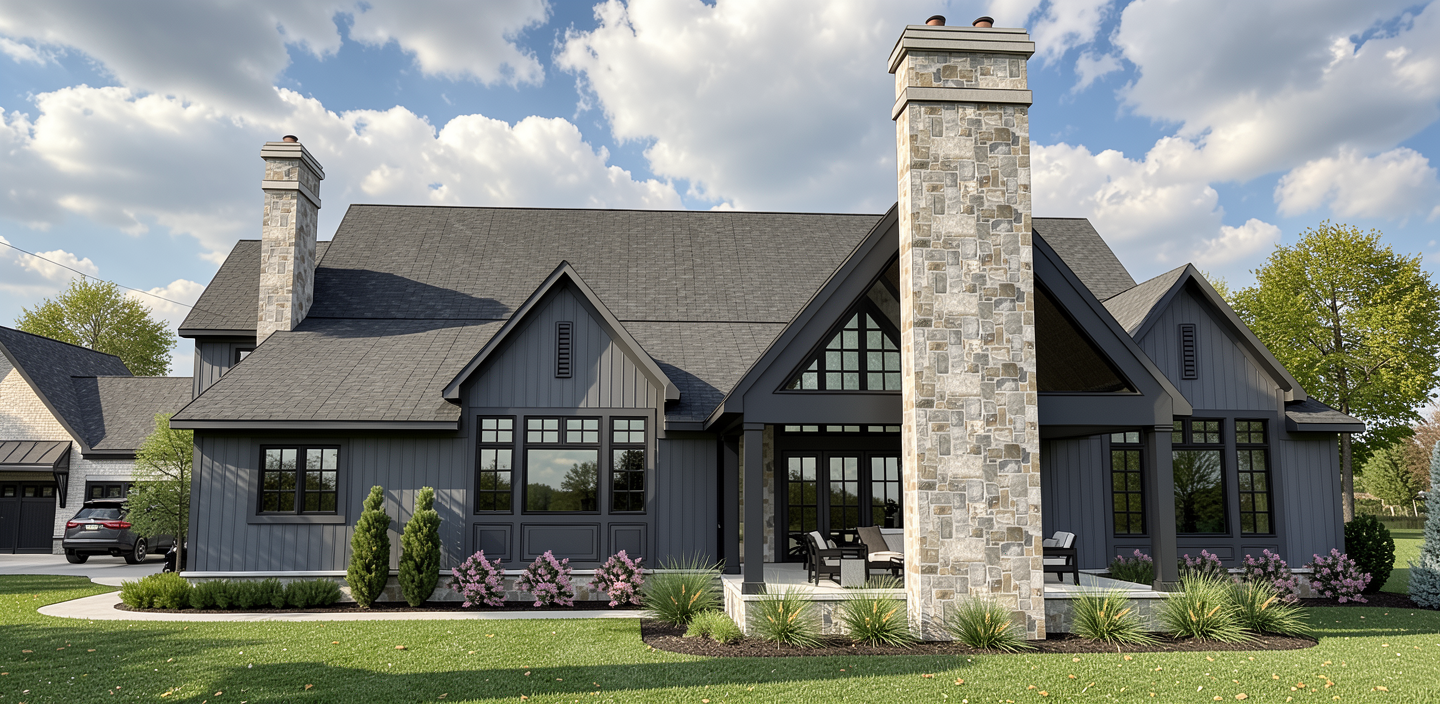mountain modern ski home warm light emanating from the windows vertical siding in weathered wood brown areas and horizontal siding in black areas snowy pine forest around the home and distant low mountains alpine glow from behind the camera