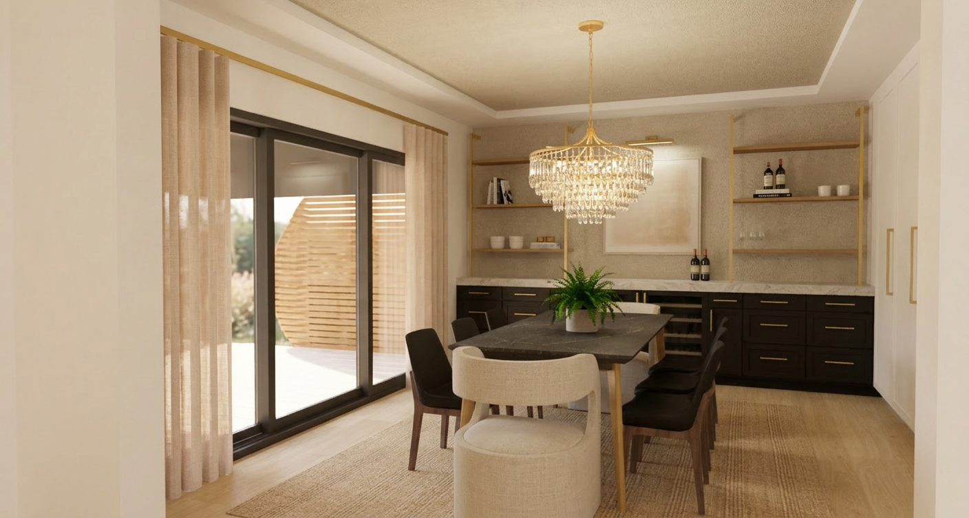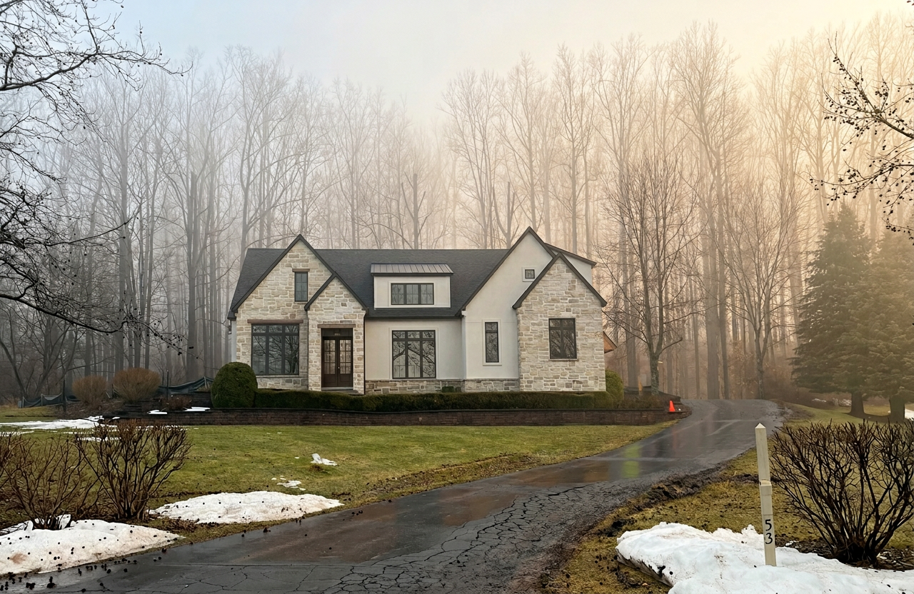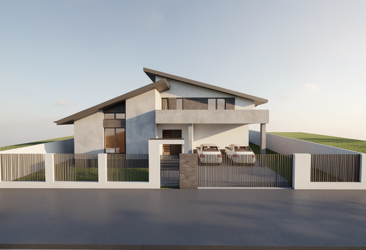 a modern house with a rustic design featuring a triangular roof structure and vertical paneling render it with warm earthy tones the exterior wood panels in rich chestnut brown complemented by slate gray roofing use off white for the window and door frames set against a serene dusk sky with soft pastel hues of peach and lavender casting gentle shadows on the building for a tranquil and inviting atmosphere