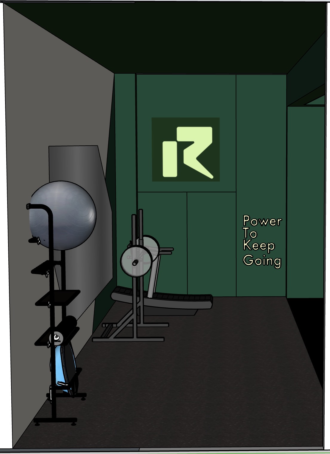 render a sleek modern gym room with a motivational atmosphere the back wall and ceiling is dark green and the mirror wall is creamy light grey a prominent motivational quote power to keep going is displayed elegantly in light neon green on the green walls the logo on the wall should be a light neon green shining vibrantly include gym equipment with metallic finishes reflecting the ambient linear led lighting a stability ball should have a glossy silver surface the floor is a dark charcoal grey rubber with a strip of black turf complementing the room s modern and motivational vibe use high contrast and dynamic lighting to create an energetic yet serene environment