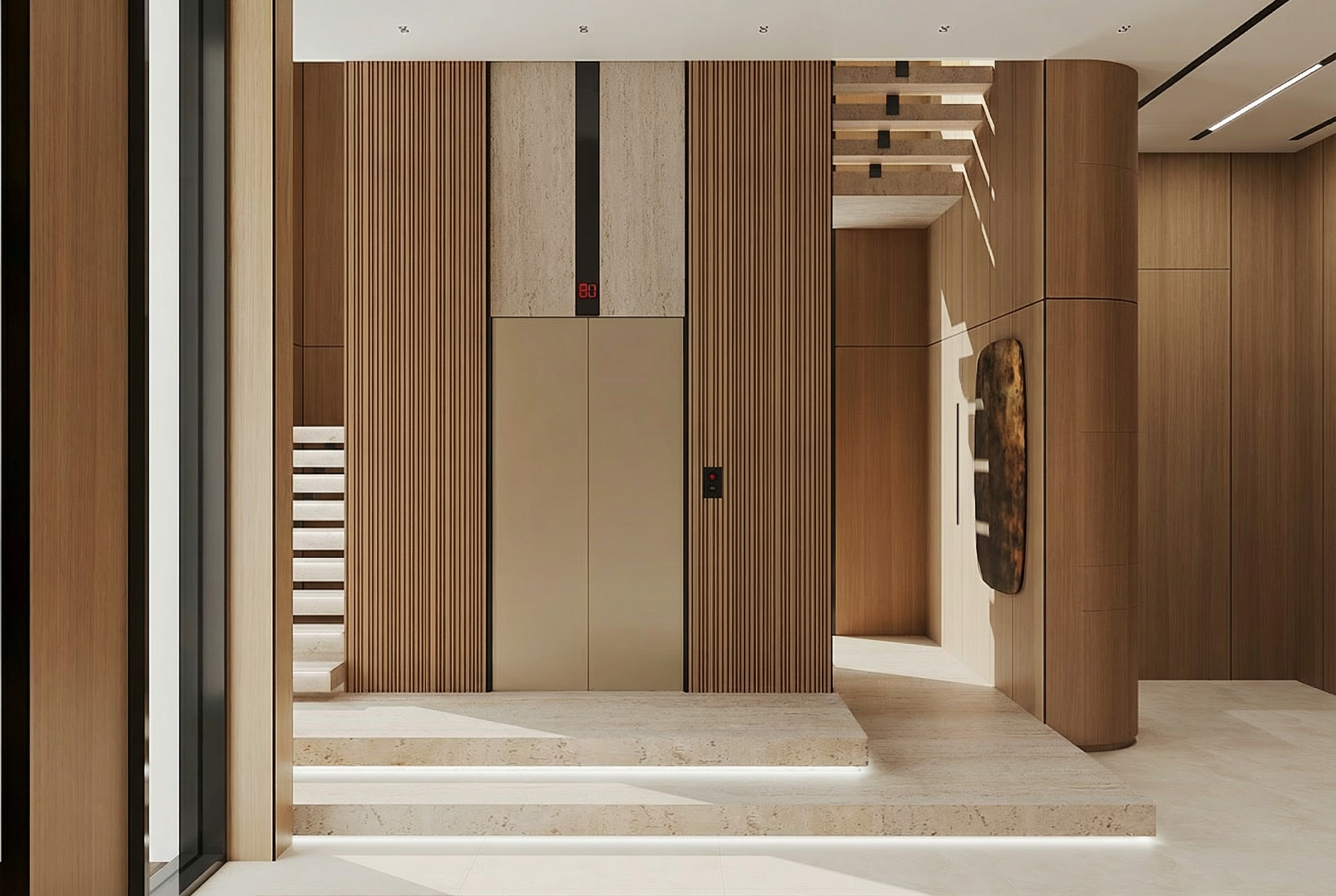 a manicured lawn lots of australian eucalyptus trees in the background and the foreground australian native ferns and plants and native shrubs and native plants stone pathway leading to the entrance an outdoor kitchen entertaining area to the left front with a sloped roof and a pathway to a firepit with seating 2 children playing more large native australian eucalyptus trees everywhere wallaby