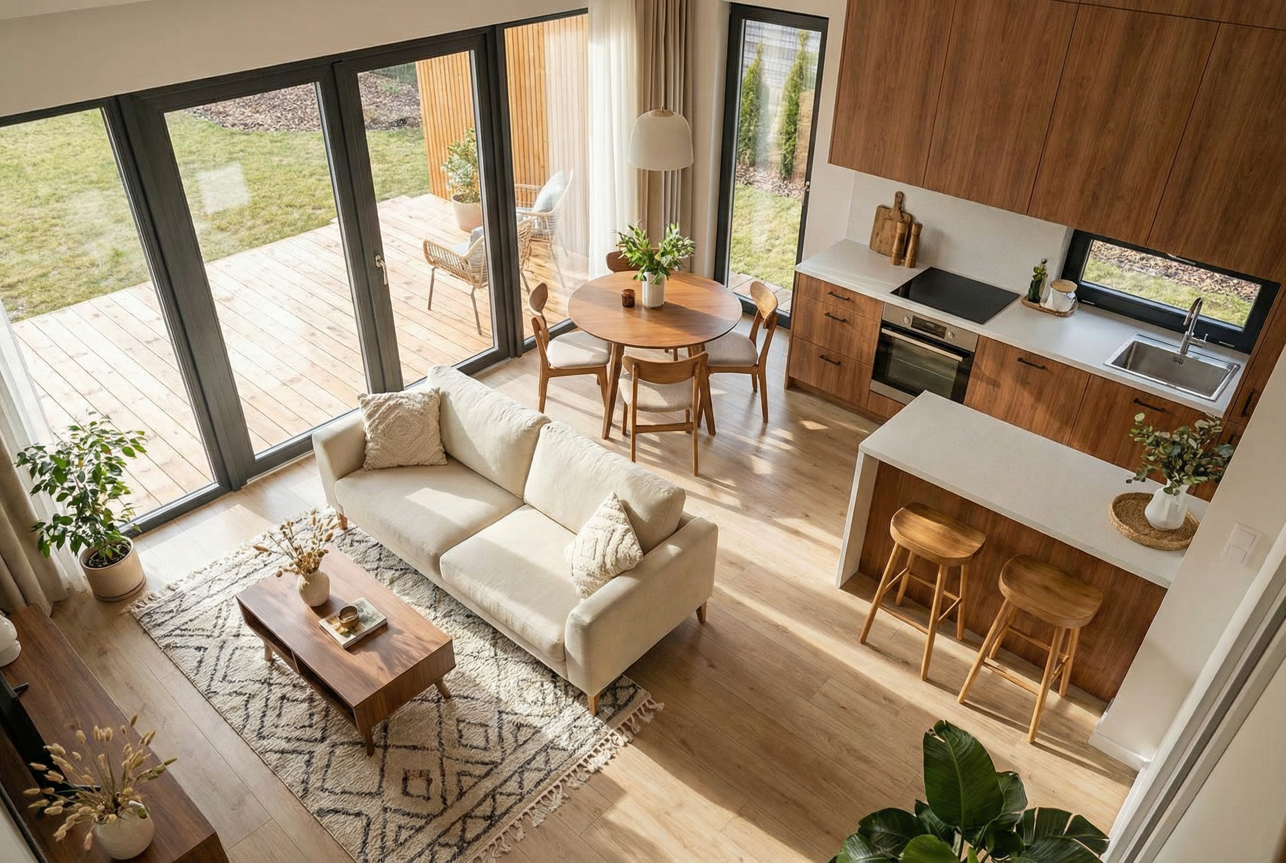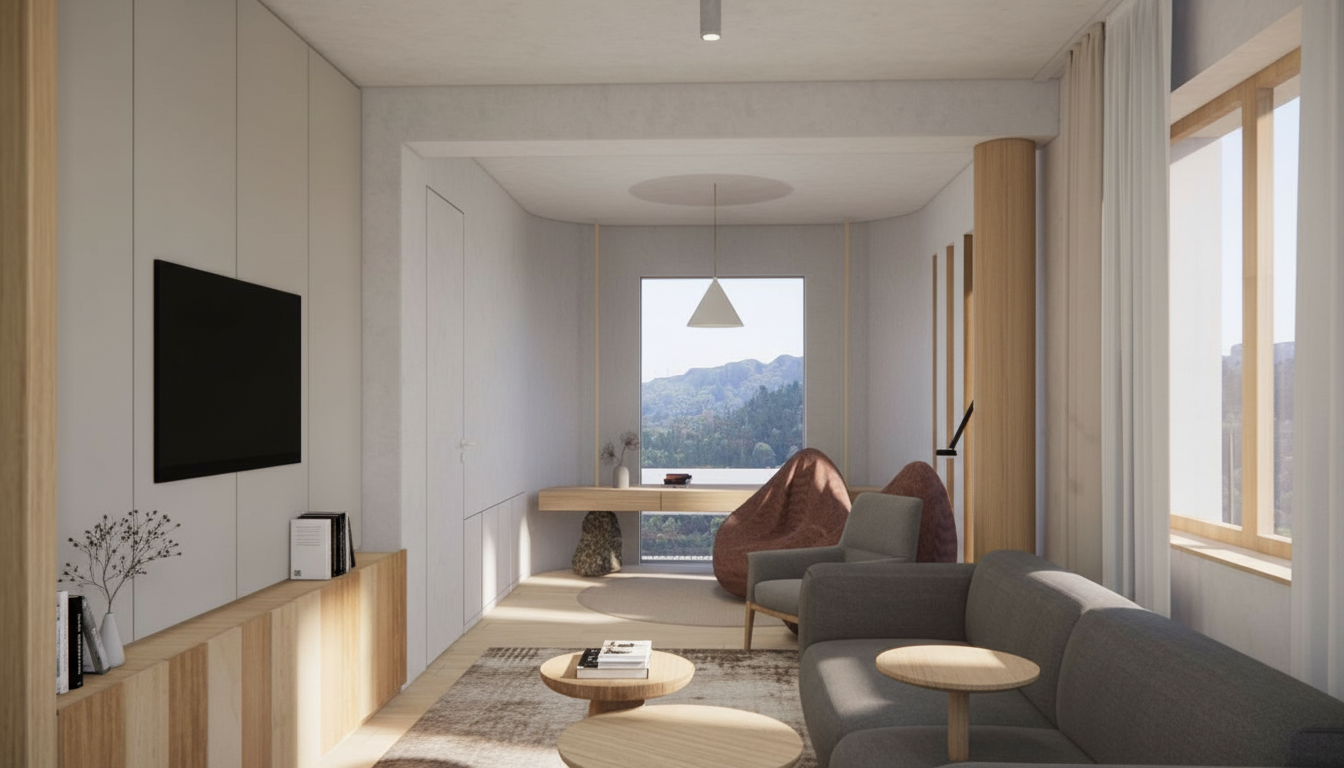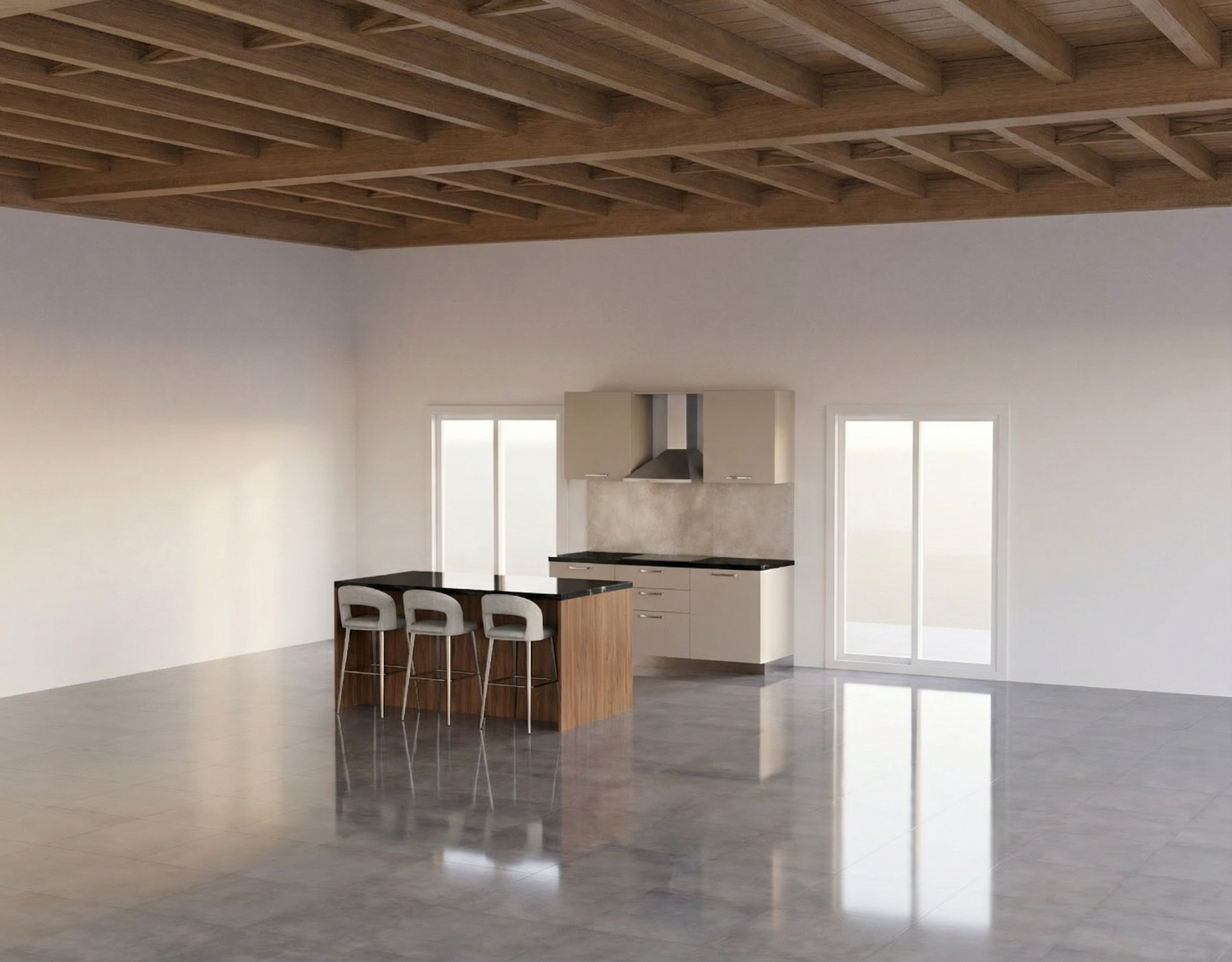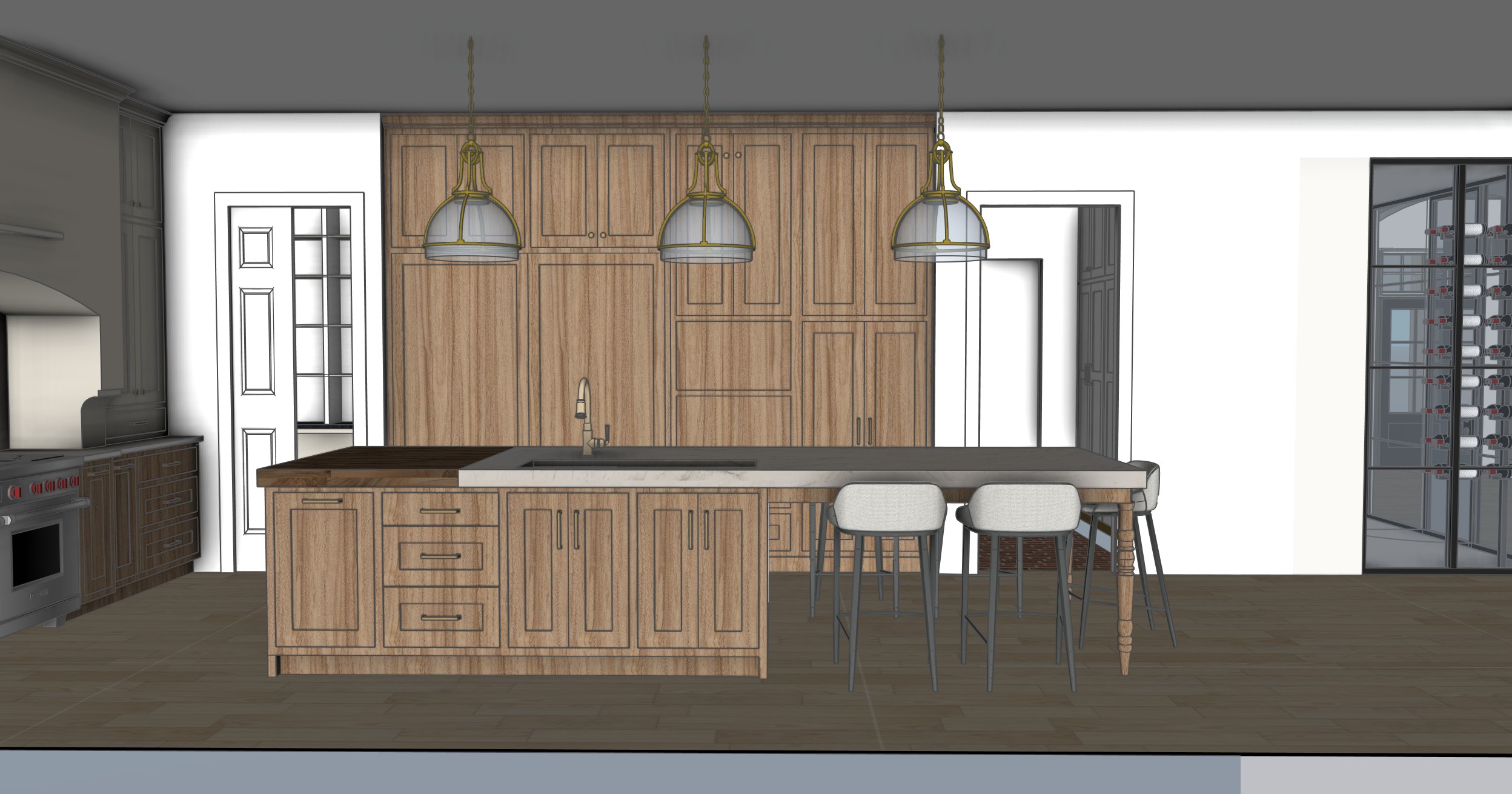 ultra realistic kitchen rendering based on a sketchup model realistic cabinetry materials sw shiitake painted range hood and hutches crystallo quartzite countertops with subtle veining accurate texture scale white oak floors with subtle wear and color variation matte painted walls with slight texture realistic fabric upholstery with visible weave physically accurate reflections and shadows soft indirect light global illumination professional interior photography crisp edges high detail clean modern aesthetic full frame camera 28mm lens
