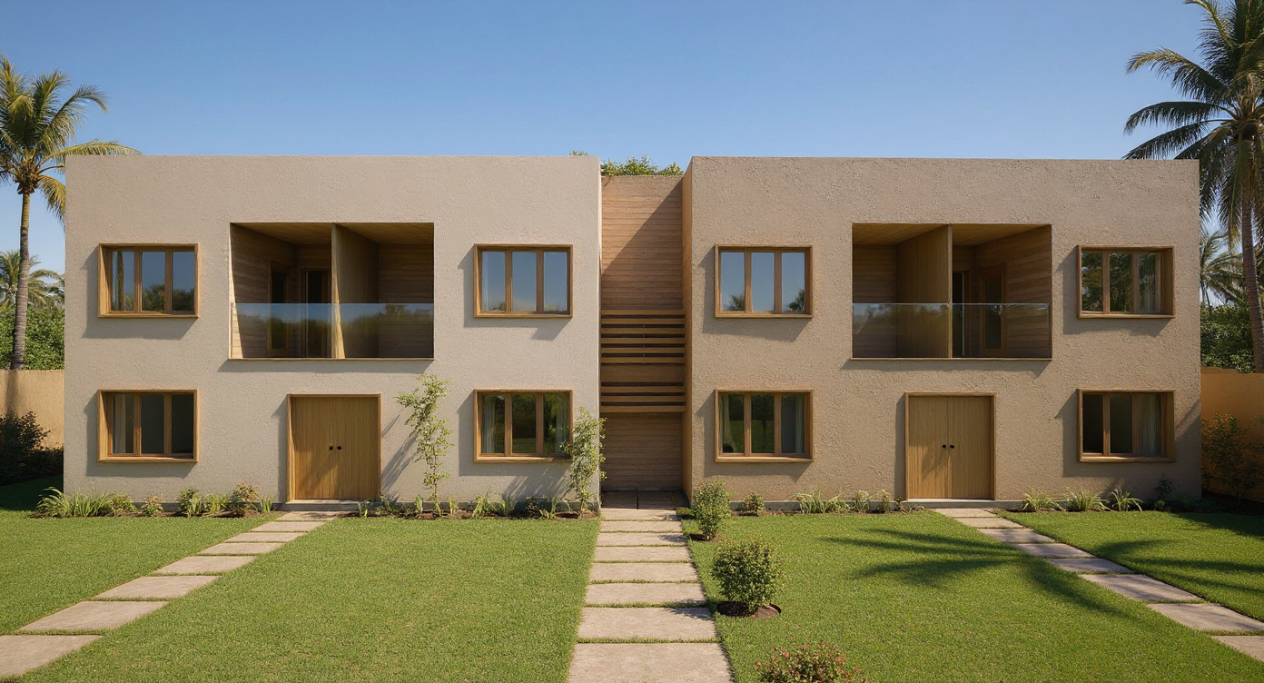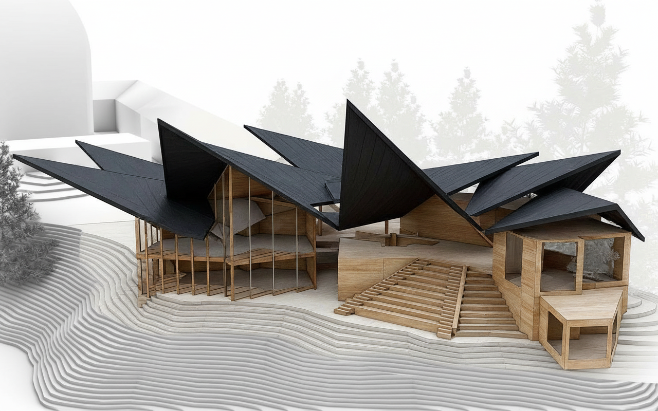 create a photo realistc visual of this architects image make the trees look real the black parts of the building are modern vertical timber cladding and the rest is poured concrete add classy planting with wild flowers make the timber boarding black