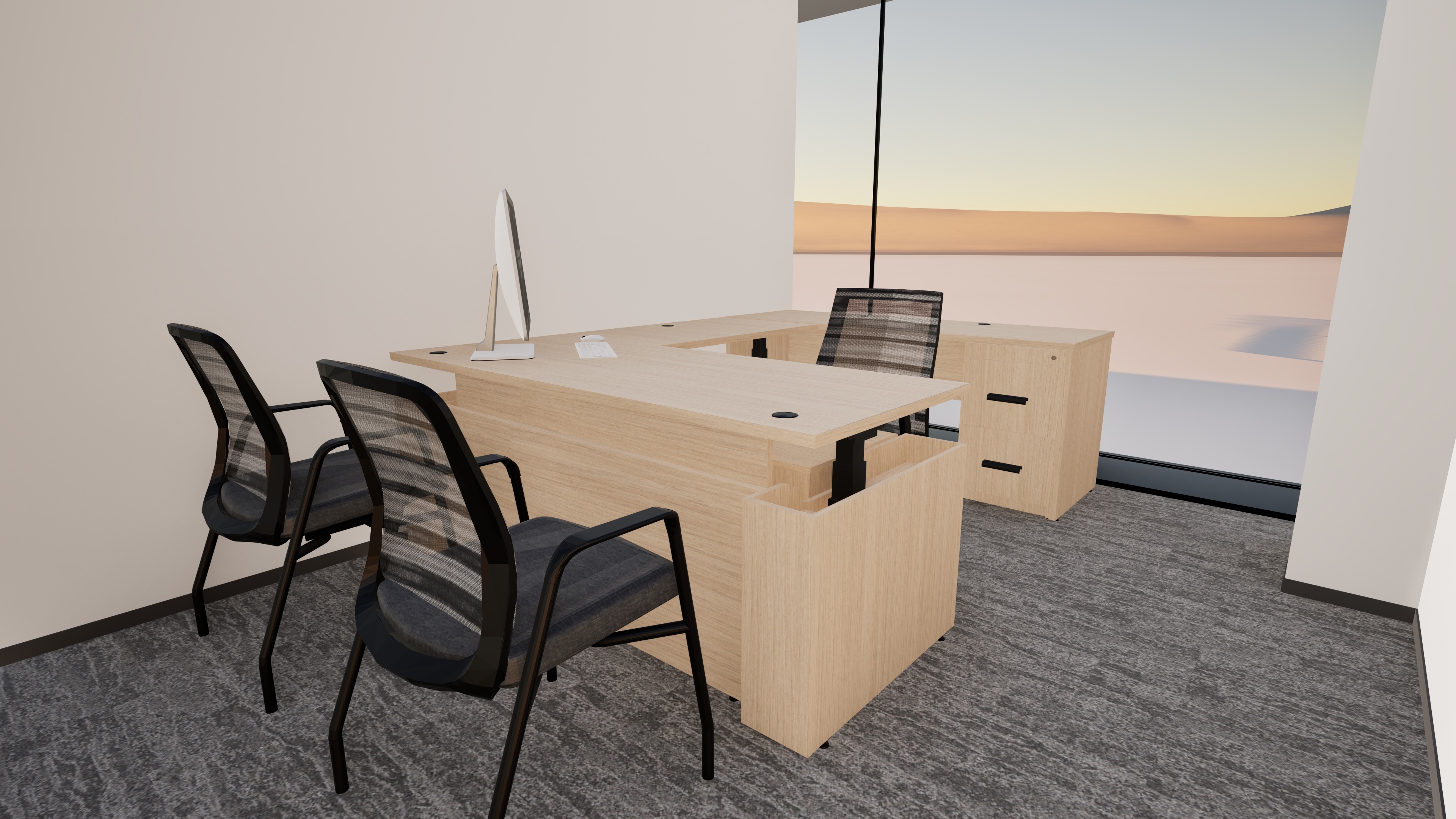 add decor make more realistic add someone sitting at the desk do not change any of the furniture or materials add a parking lot and trees in the view but the office is on the seventh floor improve the lighting and reduce shadows