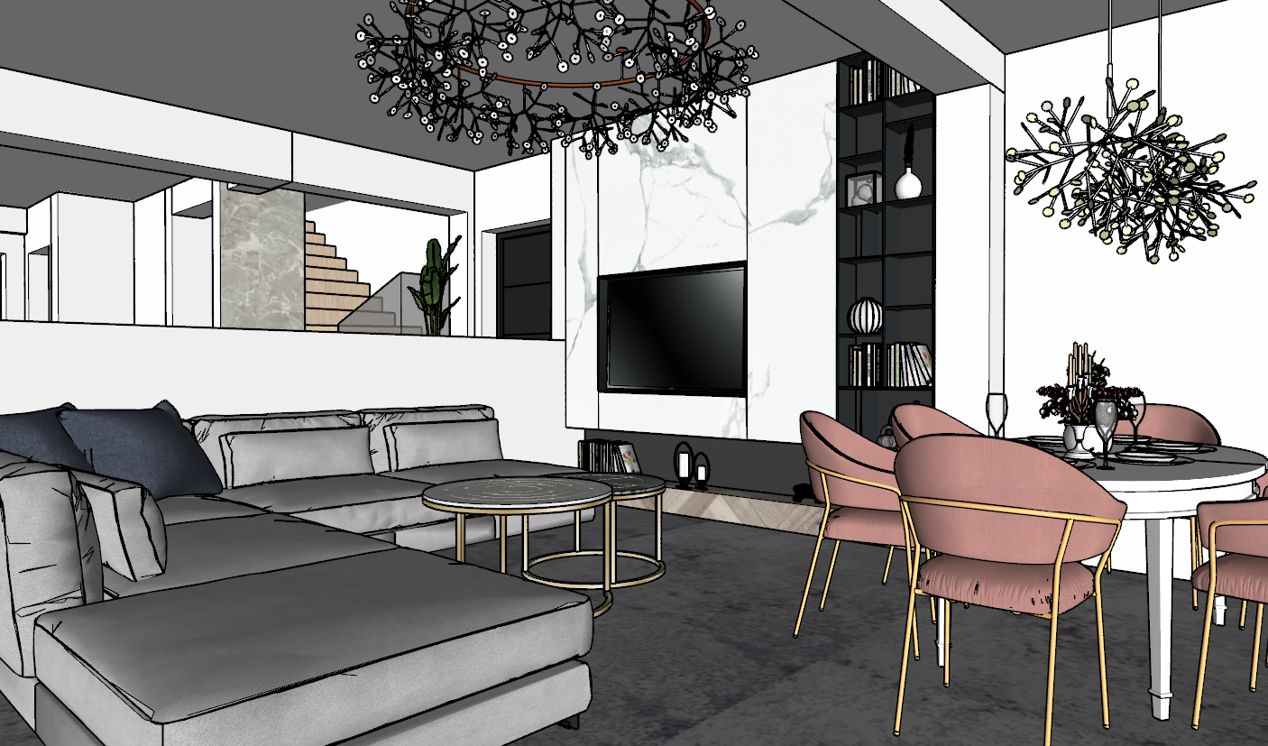 create a beautifully rendered interior design of a modern open plan living and dining area the room features a gray sectional sofa with dark blue accent pillows set against a polished gray marble floor in the dining area incorporate an oval white marble table surrounded by six elegant pink upholstered chairs the kitchen has a sleek contemporary style with a white and dark gray color scheme the atmosphere is warm and inviting with soft natural lighting that highlights the textures and colors in the space