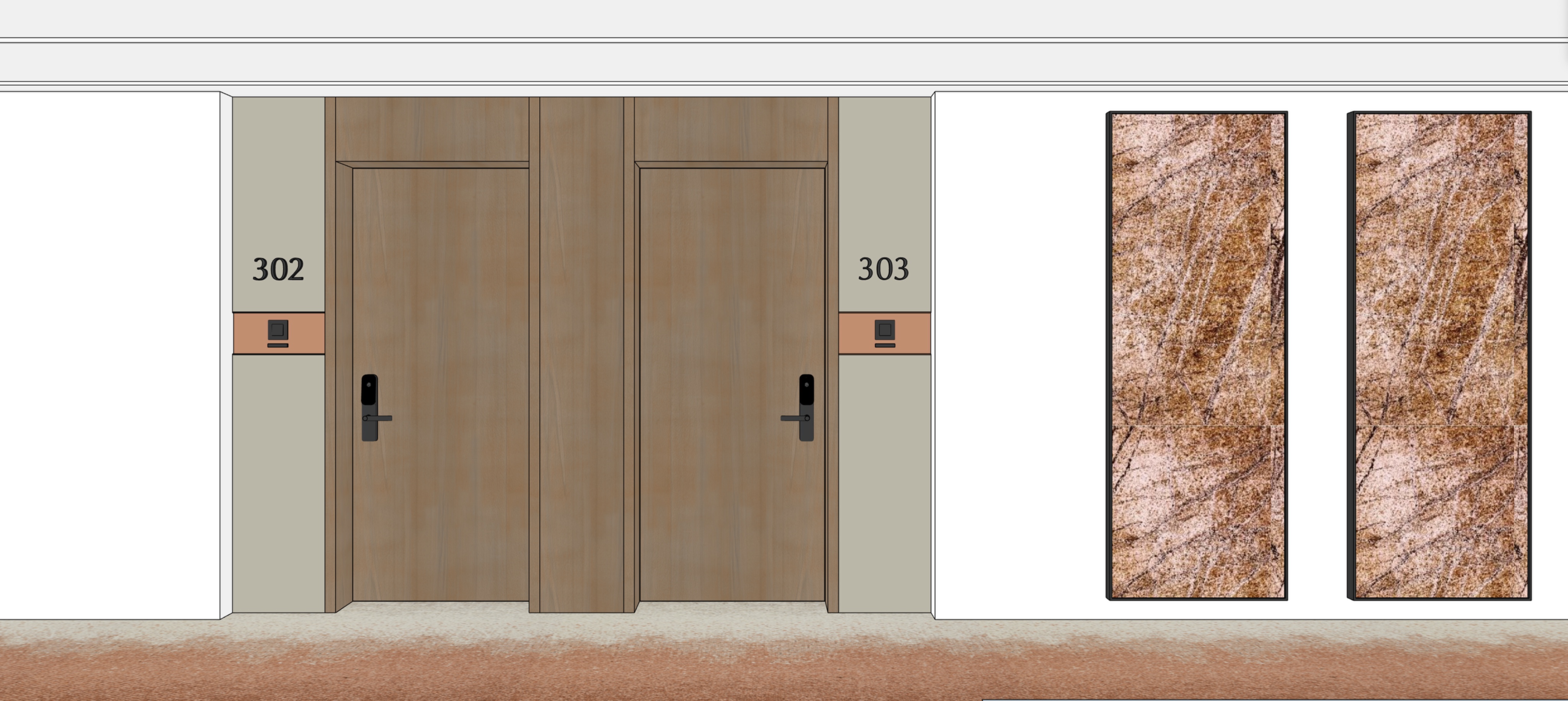 corridor in a modern luxury apartment house carpet flooring combining beige and terracotta tones smooth wood veneer with matt surface with beige midtones on the doors built in line light on the ceiling with no extra decorative lighting white walls no daylight