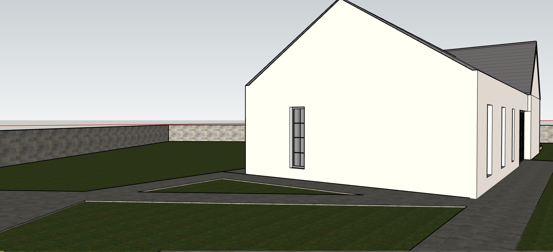 main subject and architecture photorealistic architectural visualization of a luxury single story l shaped country house the house combines traditional and modern styles the left wing features a facade of textured light natural stone limestone or sandstone with a rough surface the right wing has smooth stucco in a cream white shade the roof is gabled covered with dark grey standing seam metal with clean lines and a minimalist gutter system windows and doors large french windows and glass doors with thin black metal frames in an industrial style the glass is clear with subtle realistic reflections of the surrounding greenery and sky on the stone facade there are wall mounted exterior lamps in copper or bronze color adding a rustic touch vegetation and garden landscaping foreground rich planting of flowering plants large clusters of white and light blue hydrangeas and dense clumps of ornamental grasses miscanthus or fountain grass with fine plumes dominate purple flowers of lavender or sage are also visible trees in the center of the composition near the house stands a large mature deciduous tree likely oak or maple with a spreading crown that casts a dappled shadow on the facade and roof of the house along the right wall of the house three slender columnar cypress trees are planted adding a vertical element lawn perfectly maintained deep green english lawn mowed low with a soft texture pots large terracotta clay pots with herbs and smaller shrubs are placed on the stone terrace environment and surfaces a spacious terrace paved with large format stone pavers in grey shades slate or granite with a matte finish spreads out in front of the house in the background a masonry wall and other trees can be seen suggesting privacy and an enclosed garden lighting and atmosphere light the scene is bathed in golden hour light late afternoon or early evening the sun comes from the left side at a low angle reflections and shadows the light creates long soft tree shadows that stretch across the lawn and draw branch patterns on the light facade of the house the atmosphere is peaceful idyllic warm and inviting the sky is clear with a subtle hint of blue