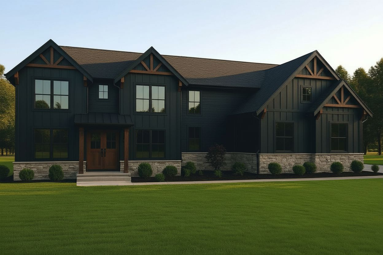 dark grey siding black windows black trim deep dark wood accents dark stone vaneer only below the windows nowhere else