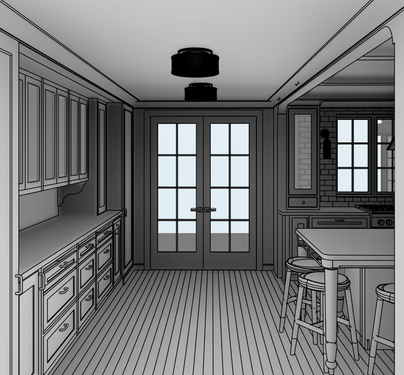 colorize so cabinet wall on left is dark dusty green with glass inserts brass hardware french doors are to exterior on the left the kitchen island on the right is walnut and the cabinets along the wall are off white floor is a medium brown 2 oak wood floor this is a view into a transitional traditional kitchen keep all elements the same all counters are calcatta marble