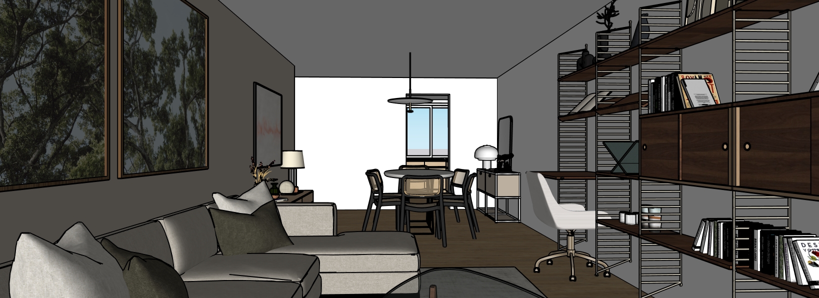 modern living room cozy and elegant atmosphere the whole walls behind the sofa is painted in soft taupe use warm lighting to create a welcoming ambiance the bookshelf is sleek with dark walnut shelves and black metal framing holding decorative items the sofa is a light gray color with plush cushions in earthy tones olive green and beige the armchair is a mid century modern design in white fabric the round dining table is off white curtains are sheer gently filtering light add abstract paintings with subtle hues of orange and gray include a floor lamp with a minimalist black base overall maintain a balance of modern sophistication and warmth the rug behind the sofa in light gray and beige tones
