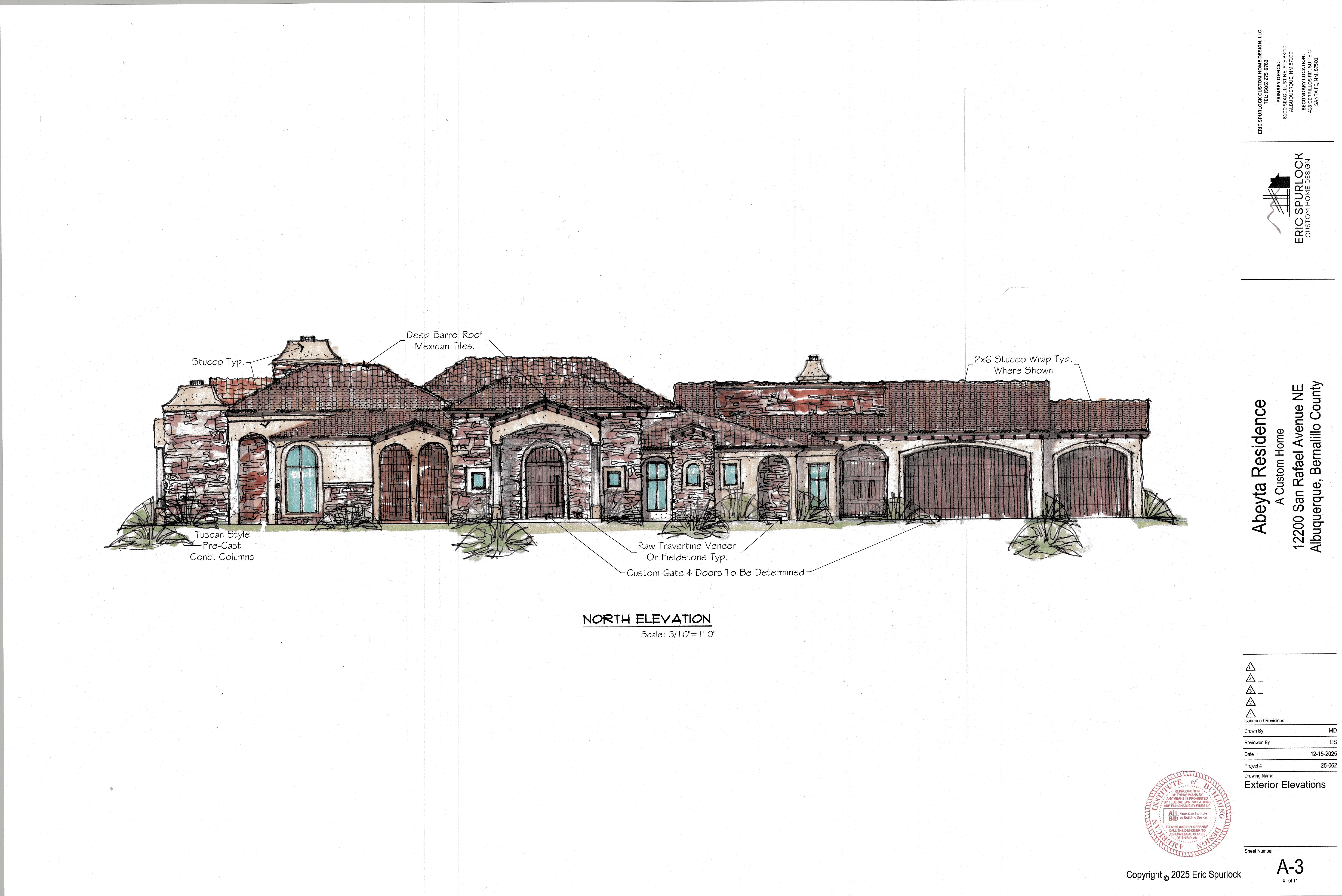 deep barrel roof mexican roof tiles stucco home with raw travertine stone tuscan style pre cast columns new mexico landscape