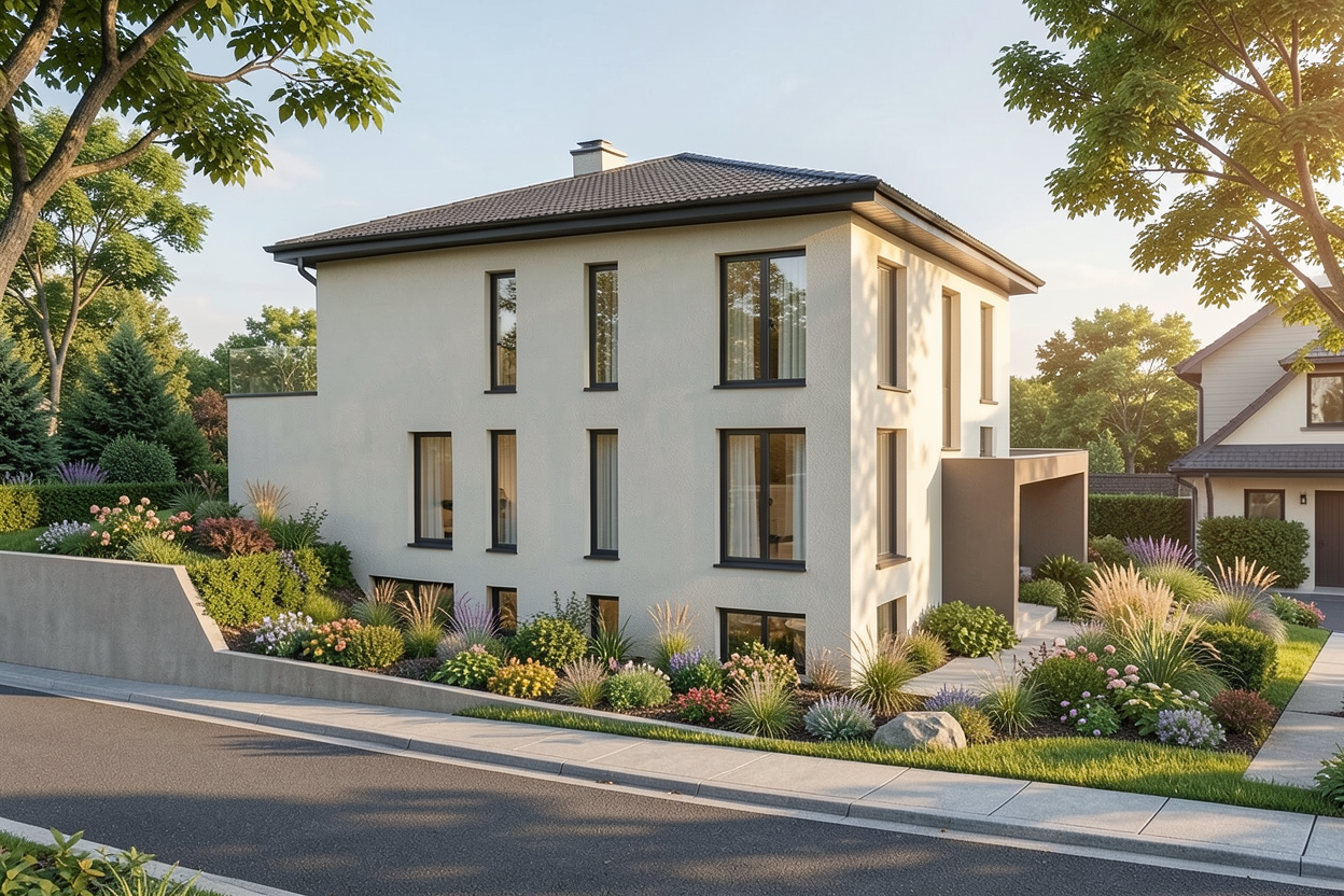 a modern two story house with large windows and a flat roof the house exterior is rendered in crisp white with sleek black window frames the garage door is a smooth matte black and the connecting facade features light beige wood paneling the house sits on a subtle green lawn with a grey driveway in the foreground
