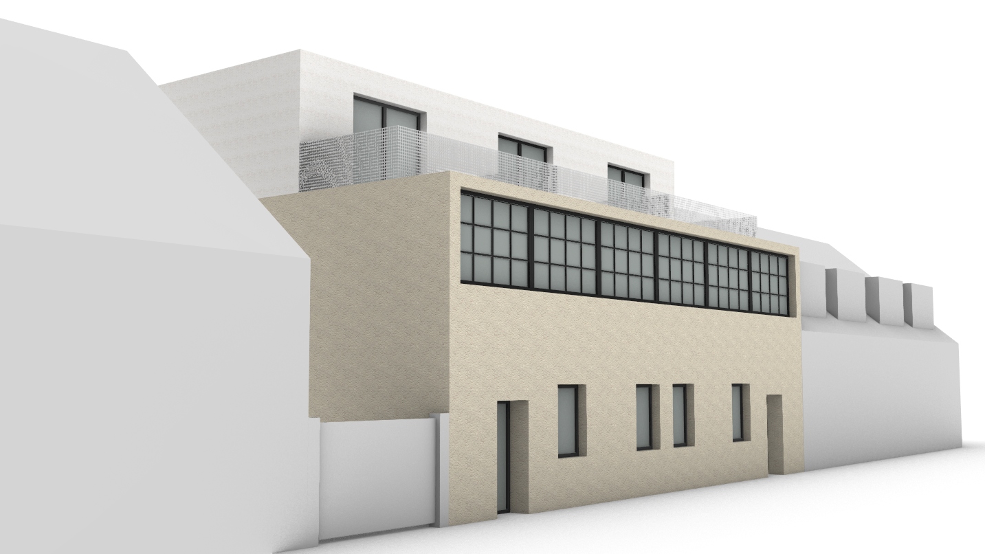 soft light in windows white curtians curtains white railings with white steel mesh in front pavement with road top floor white plaster