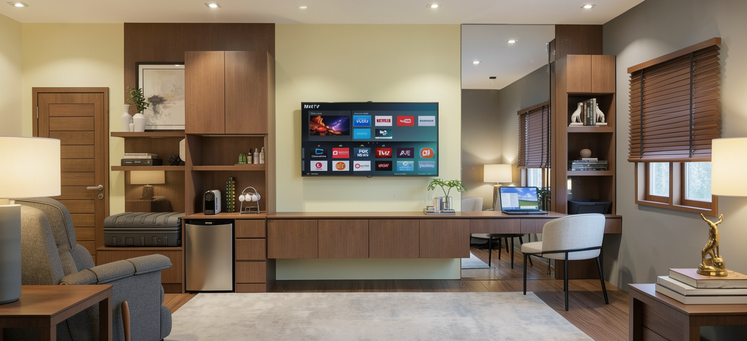 change the yellow wall into stucco beige finish display cabinet and shelves with lights on
