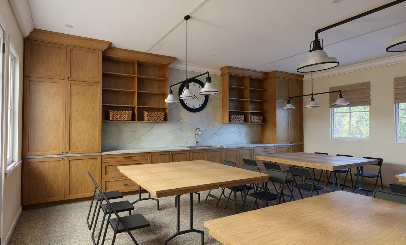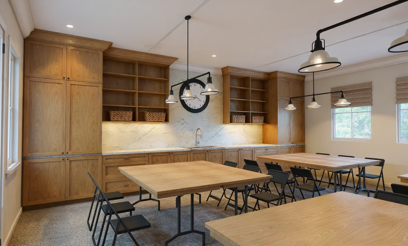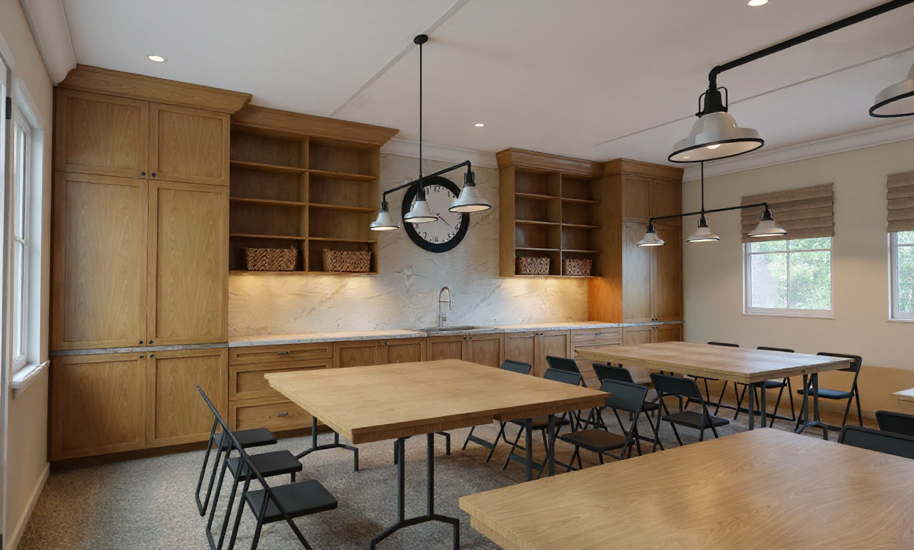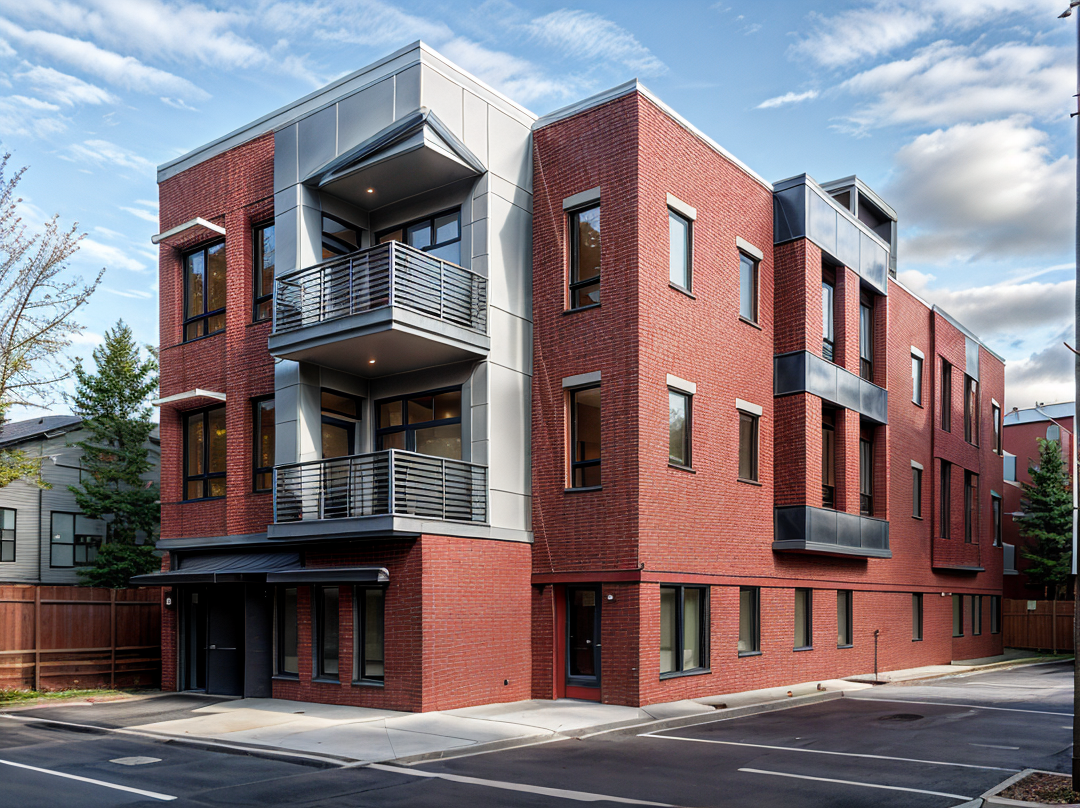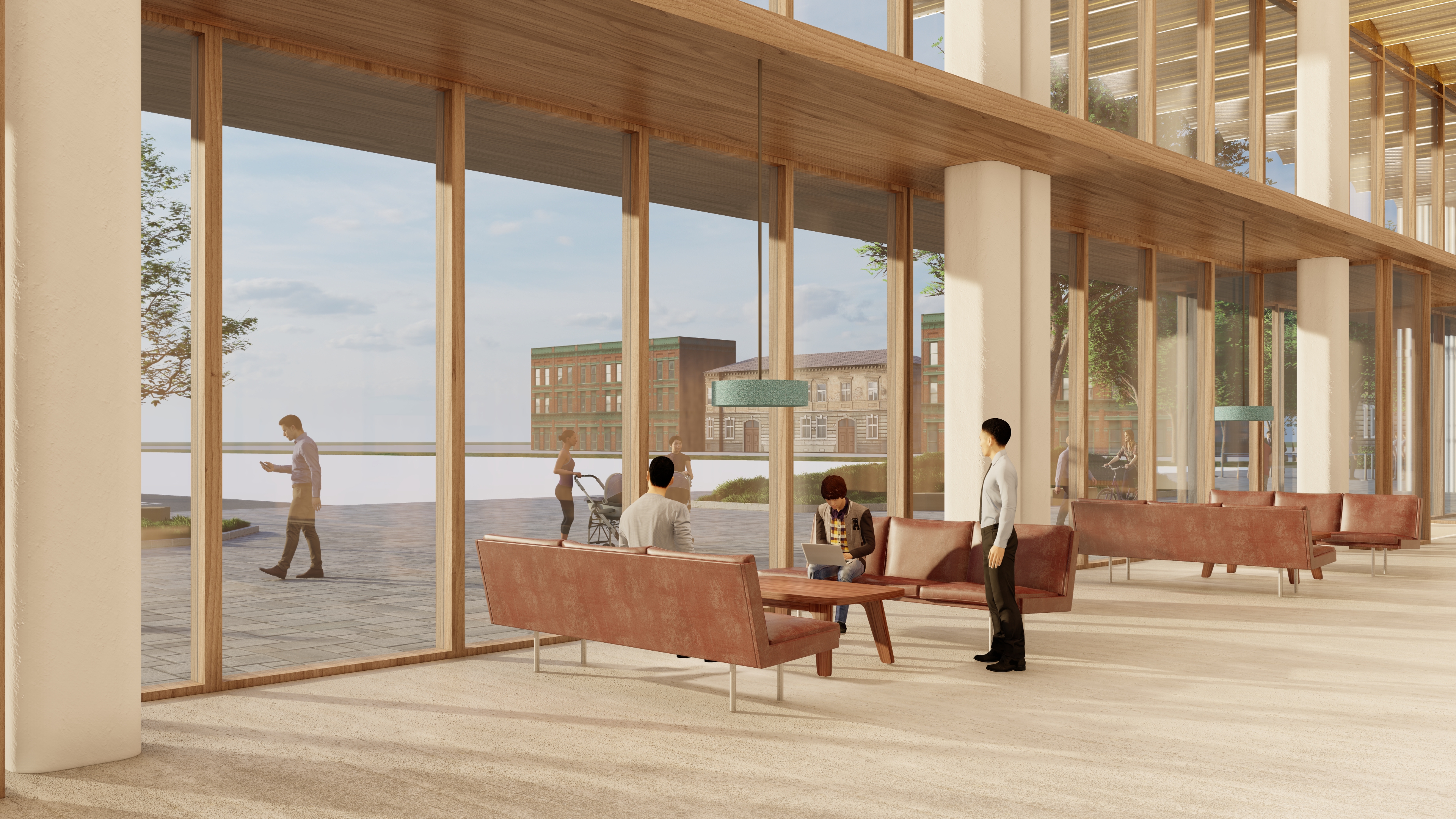 a modern indoor seating area with large floor to ceiling windows the ceiling and window frames are warm light wood giving a cozy atmosphere the walls are soft white complementing the earthy tones the furniture features smooth muted red upholstery with sleek lines enhancing a contemporary look outside the windows there s a bright blue sky with fluffy white clouds casting soft natural light into the room the buildings across are a rustic brick red and light beige adding a touch of urban charm the overall atmosphere is peaceful and welcoming with a sense of open space and natural elements blending seamlessly with urban elegance architecture
