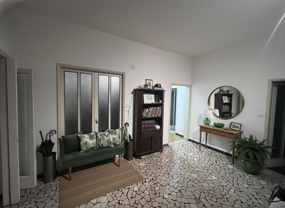 create a clean and crisp photorealistic image from the attached photo do not change the shape of furniture or accessories but increase the quality of textures this is to be a penthouse open plan kitchen living dining room with tall matt lacquered soft grey wall paneling around the tv area the kitchen area consists of the same colour lacquered furniture doors but with worktops on island and and splash back materials to be in terza dimensione stone t this texture material can be found in link below floor to be large format square tiles https www terzadimensione com en products stone t