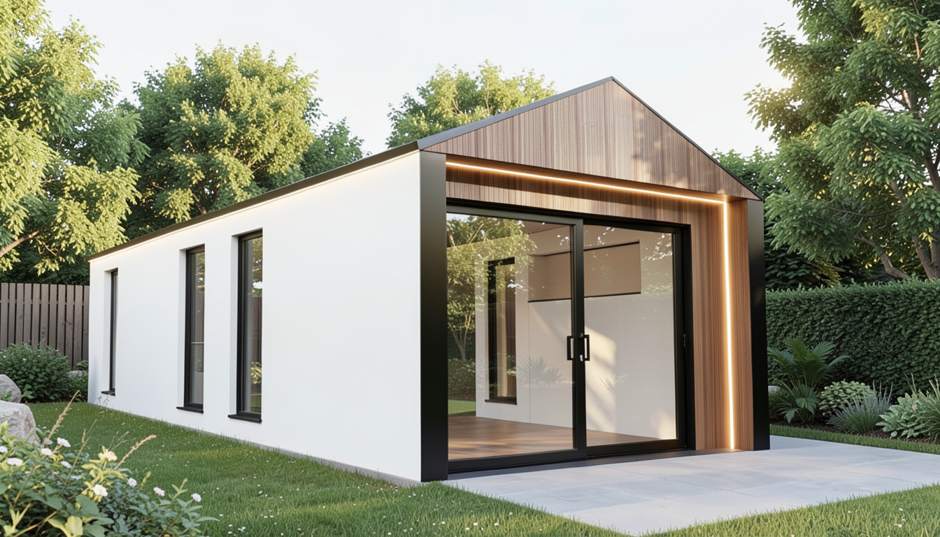 sliding door to front with a black cladding to the side and a cedar cladding to the front on the sliding door side