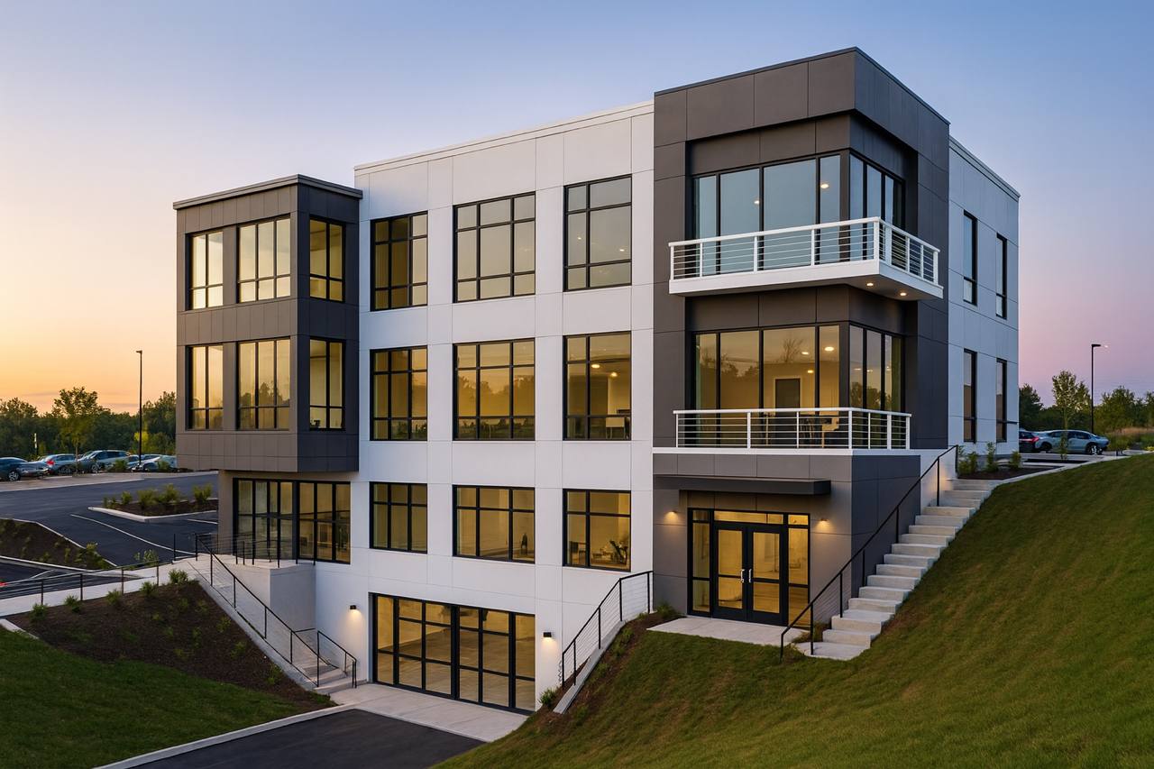 modern office building based on the site plan and grades i have attached in cad file style on the png