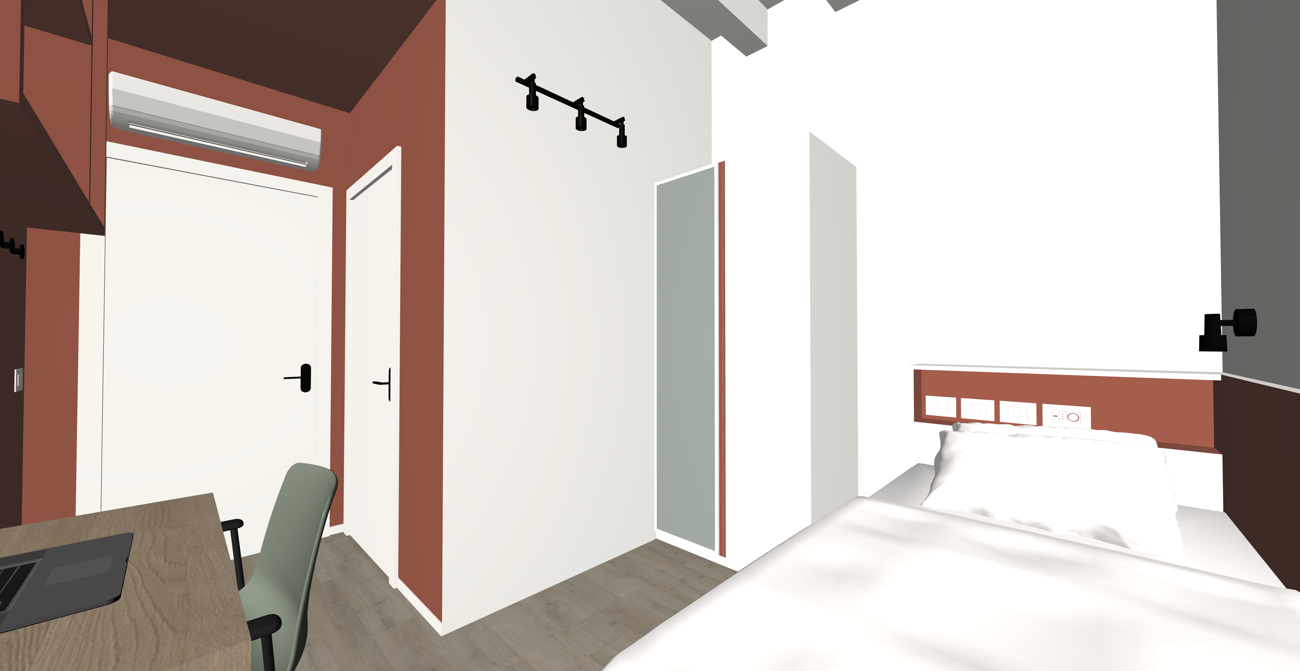 anta dell armadio di sinistra specchiata mantieni gola armadio colorata le parti in legno sono in rovere naturale senza nodi parquet rovere senza nodi arreda la stanza come uno studente universitario mantieni colori arredi dell immagine non aggiungere mobili