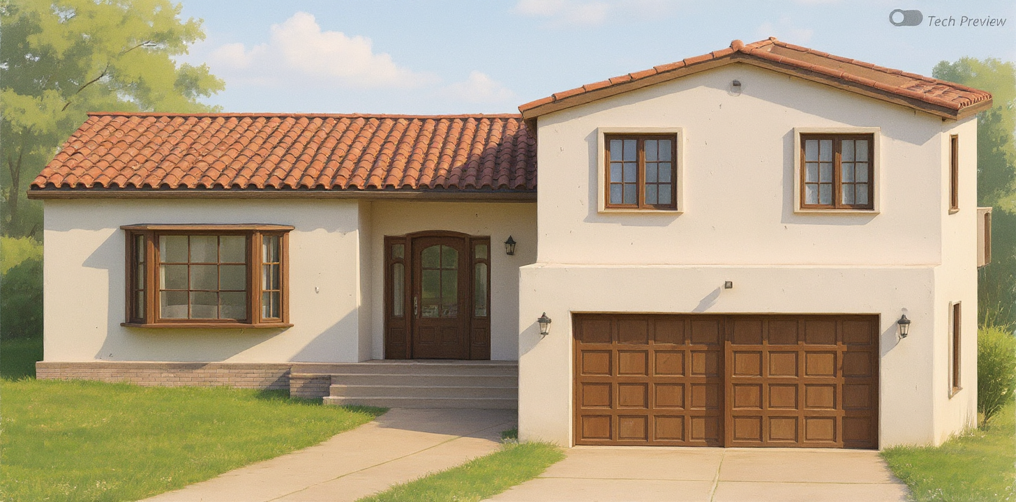 spanish revival house brown door white stucco walls red clay tile roof change environment to be more desert like add more landscaping to environment change rendering to water color sketch make redering more like a sketch