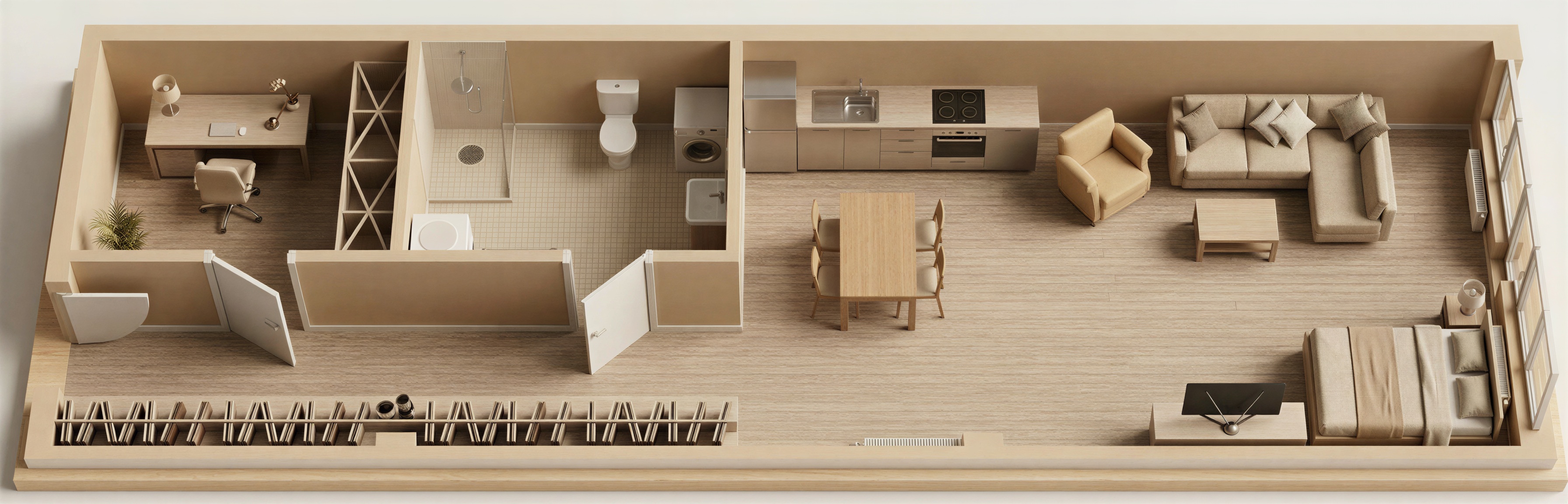 convert this floor plan into a realistic isometric 3d view of a full house show the space from an elevated angle with furniture walls and details visible change walls for white don t change anything else use the same furniture as shows on the plan do not change the orientation of the floorplan