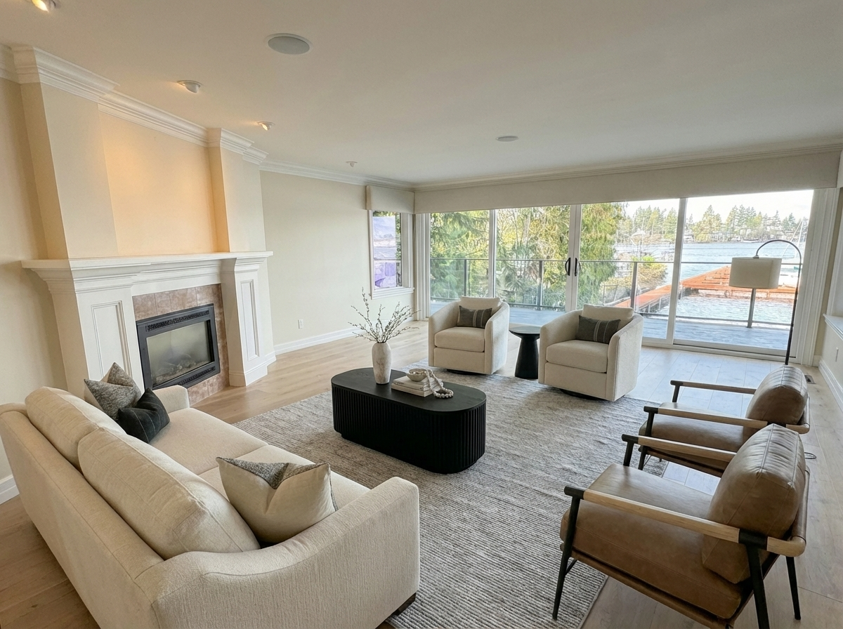 i want to re arrange the furniture in this space switch the couch with the 2 leather accent chairs change the orientation of the coffee table by 45 degrees put the floor plan to the left of the fireplace do not change or reinterpret anything else in this space