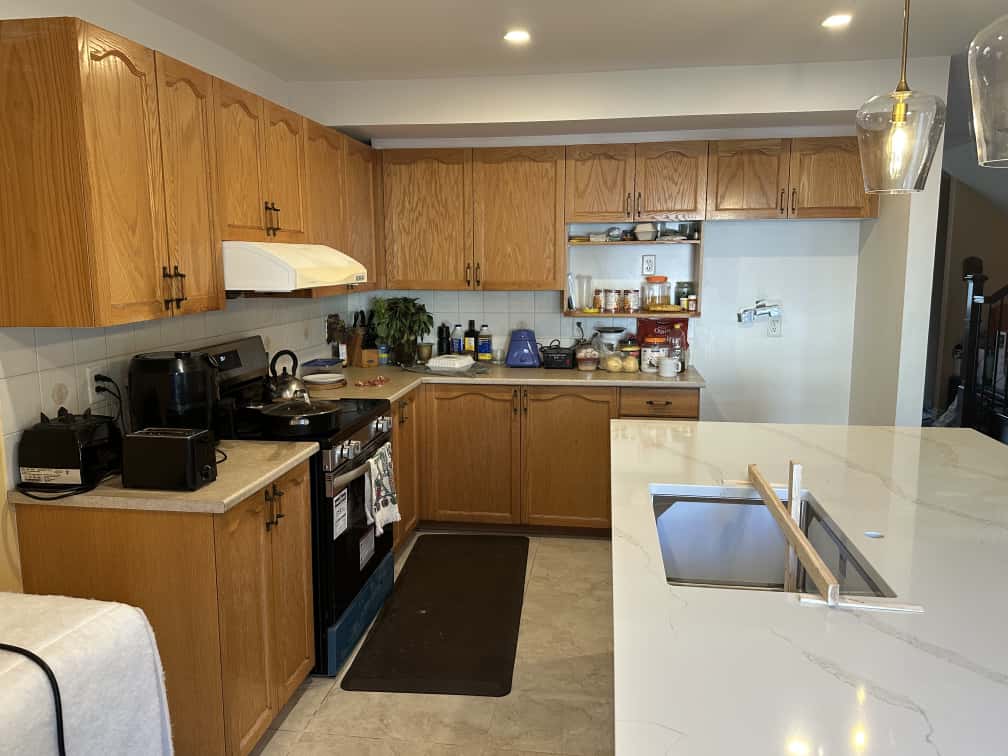 modernist exterior shot the wall where there is a fridge opening have that entire wall have tall pantries and a opening for a fridge on the far left on the right hand side remove all uppers make a square brass hood fan change all lowers and color of the theme to shaker white cabinets do not change the countertop architecture