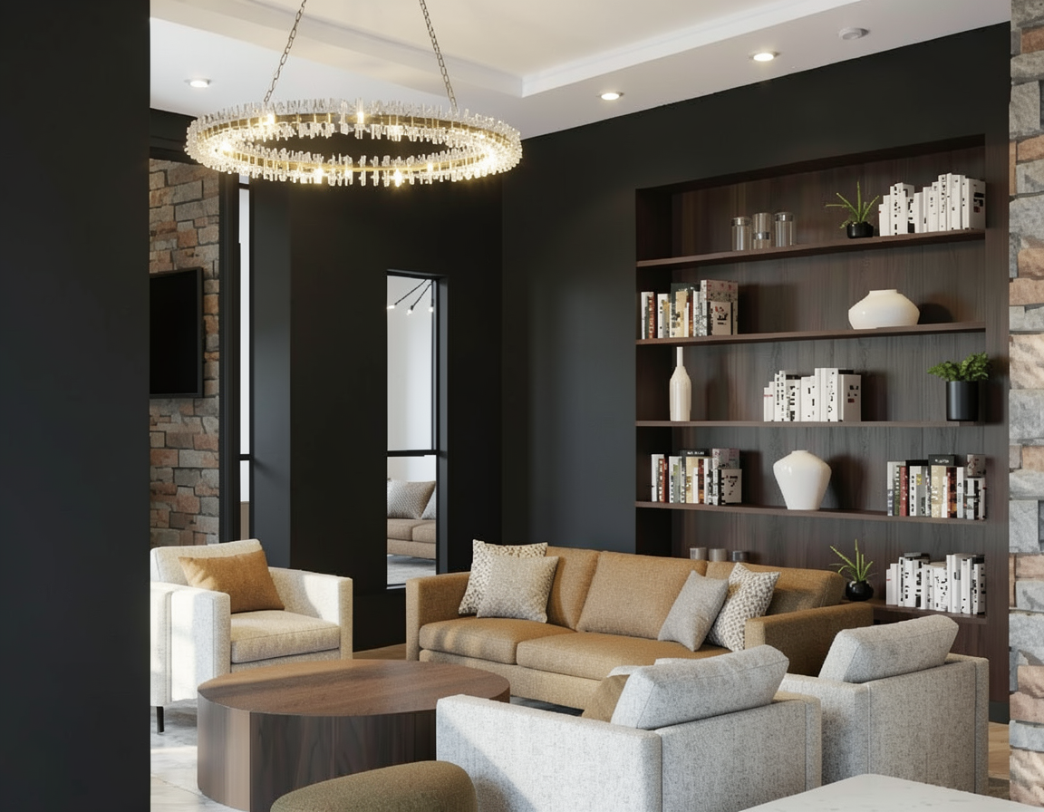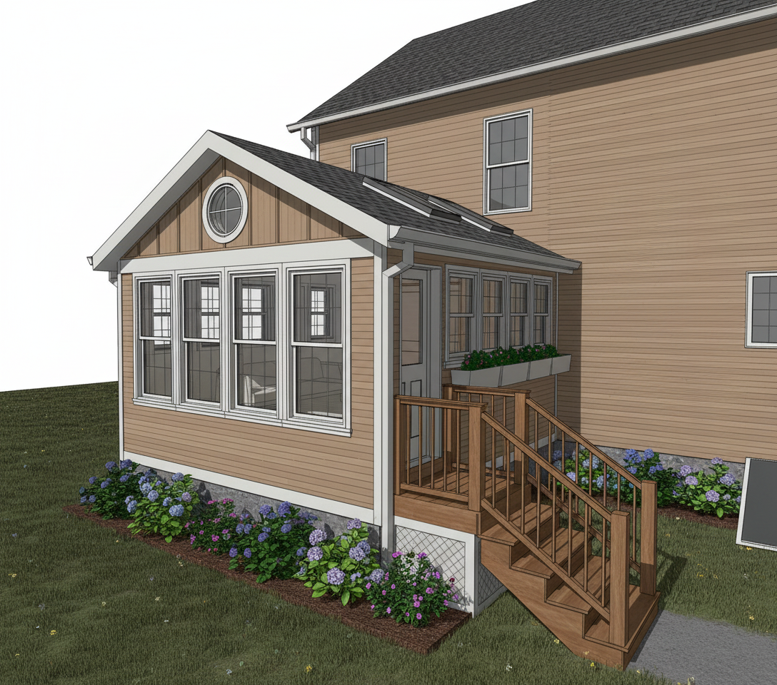 keep all the exterior materials the same except have the material that wraps around the inside of the protruding rectangles match the wood of the ceiling also remove the mountains in the background