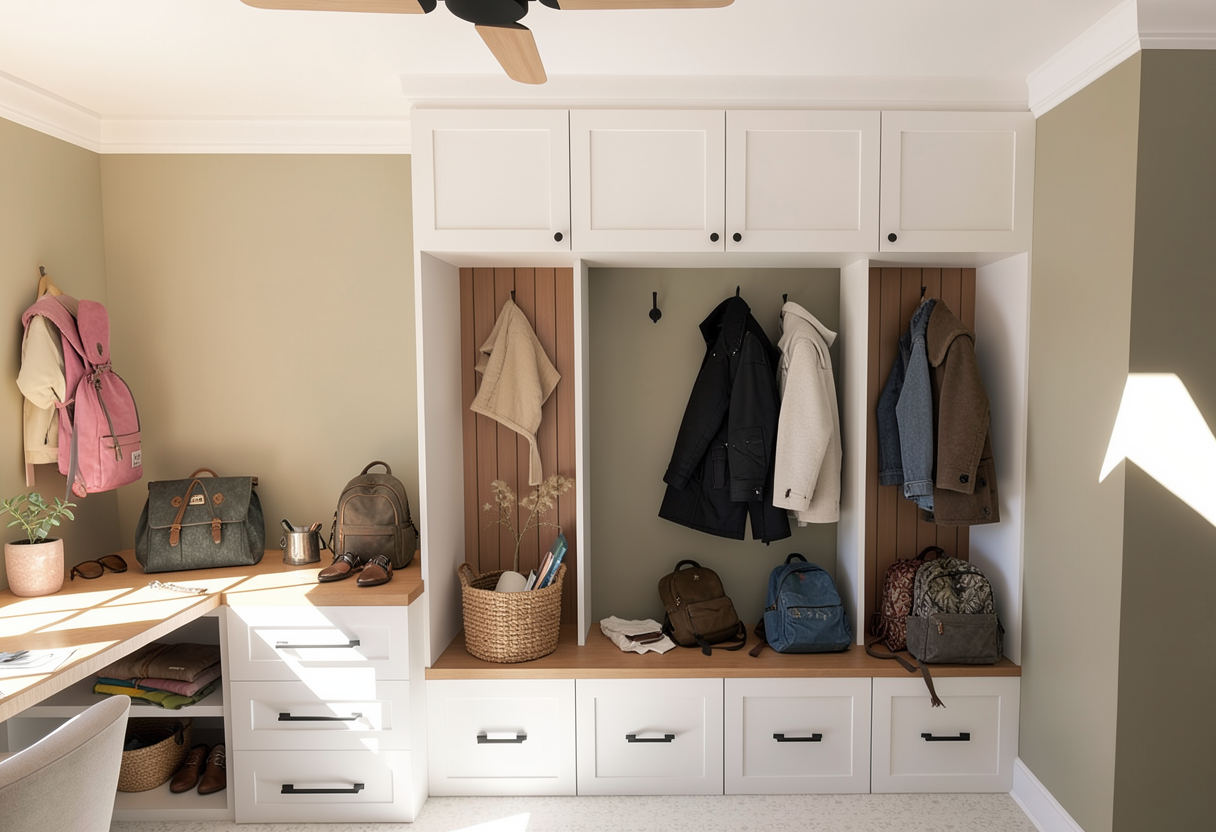 very lightly accessorize this bench area as an entry way with just 2 coats and backpacks