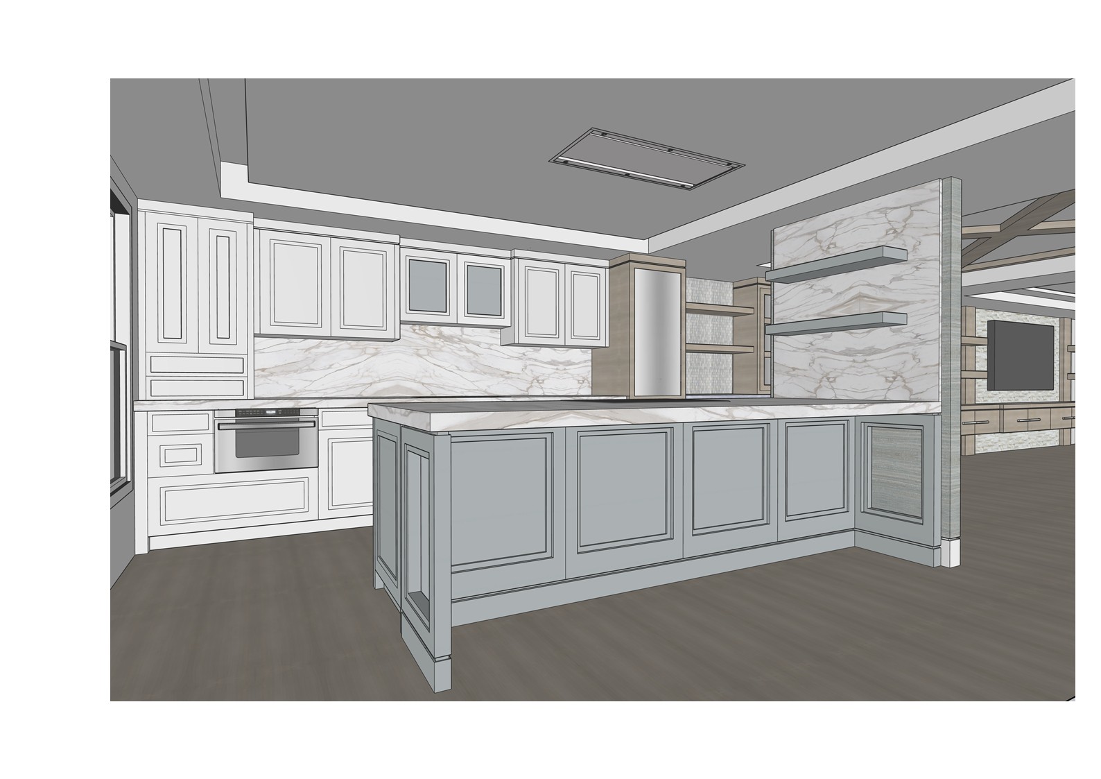 transform the provided elevation into a hyper realistic interior photograph that is indistinguishable from a real professionally shot interior design photograph this must read as a real space captured by a camera not a rendering not a visualization not architectural cg not concept art and not an illustration geometry lock non negotiable preserve the exact original geometry layout proportions ceiling details wall depths panel divisions openings doors cabinetry locations millwork dimensions built ins and circulation paths with zero architectural changes nothing may move scale simplify or be reinterpreted geometry must remain absolutely unchanged camera derivation critical derive the camera position height angle and framing strictly from the uploaded elevation eye level interior photography centered or naturally balanced composition 24 35mm interior lens feel no dramatic angles no stylized framing do not reuse or approximate camera framing from any previous image remove all drawing artifacts completely remove all linework cad edges drafting outlines diagrammatic shapes sketch artifacts nothing may appear outlined flat schematic or illustrative the elevation must be visually reinterpreted as a finished real interior photograph material realism rules wood if present smooth solid plank material extremely subtle restrained grain matte or soft satin finish only no graphic patterns no decorative striping no visual noise wood must absorb light gently never glossy or sharp fabric upholstery if present soft compression subtle seams gentle shadowing natural fabric texture no flat color blocks stone slabs if present light natural veining soft organic variation low contrast no symmetry no bold or busy patterns stone must feel heavy and grounded walls fine surface texture slight tonal variation never flat paint edge construction realism all edges corners joints and transitions must be softly broken and physically realistic no razor sharp corners no cgi perfect edges slight construction tolerances only everything must read as fabricated installed and dimensional lighting photographic behavior lighting must behave like real high end interior photography natural daylight only unless otherwise specified realistic light bounce gentle shadow falloff uneven exposure distribution subtle brightness variation across surfaces avoid studio lighting uniform illumination over clean exposure global illumination look slight softness is preferred over sharpness camera image imperfections very important introduce subtle photographic characteristics gentle lens softness micro exposure variation natural contrast roll off mild atmospheric depth primary plane sharp background slightly softer the image must feel captured not generated absolute constraints no creative interpretation no stylization no exaggeration no added or removed elements any deviation from the original elevation geometry or intent is unacceptable negative prompt always include architectural rendering 3d visualization cgi unreal engine octane vray sketchup look flat textures graphic lines outlined edges over sharpened studio lighting concept art illustration ai look plastic materials glossy wood high contrast grain perfect symmetry keep design as shown in the picture keep the design as it is in image light cabinets are white and brown cabinets are white oak keep design in the image as it is including materials keep the materials as in image
