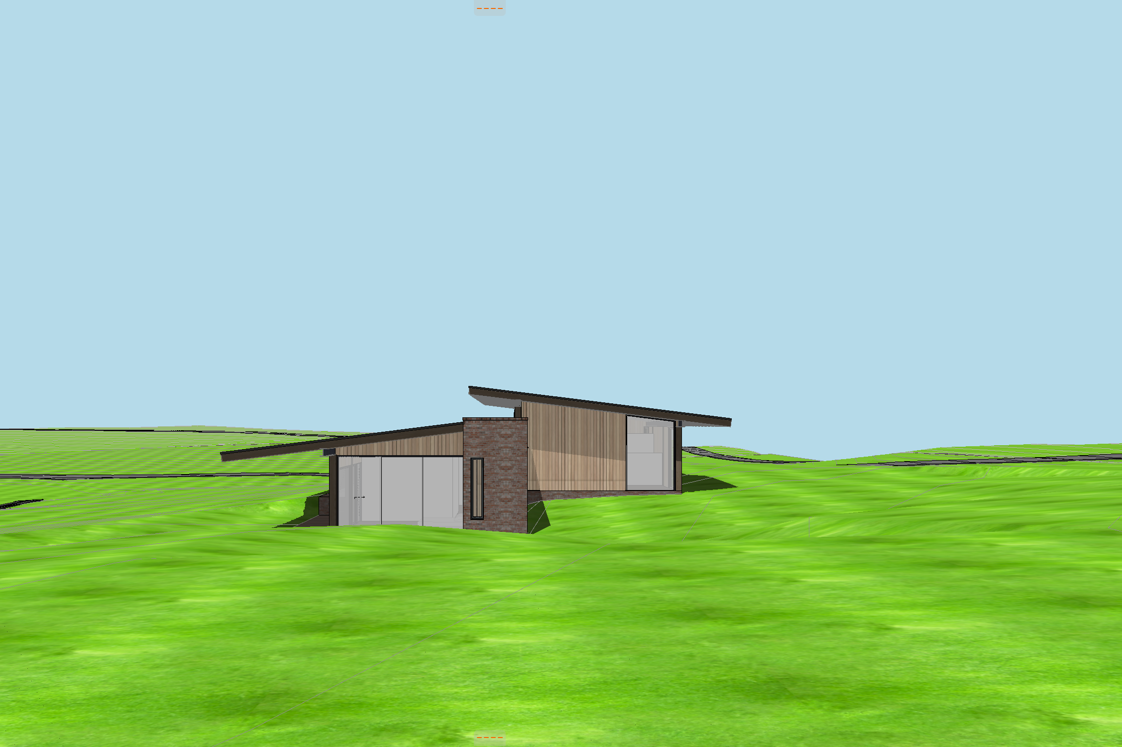 antique brick house with timber columns steel beams glass windows wild lousiana grasses and vibrant wildflowers all the way to house southern yellow pine trees in the background clouds in the sky all glass should be reflective not see through