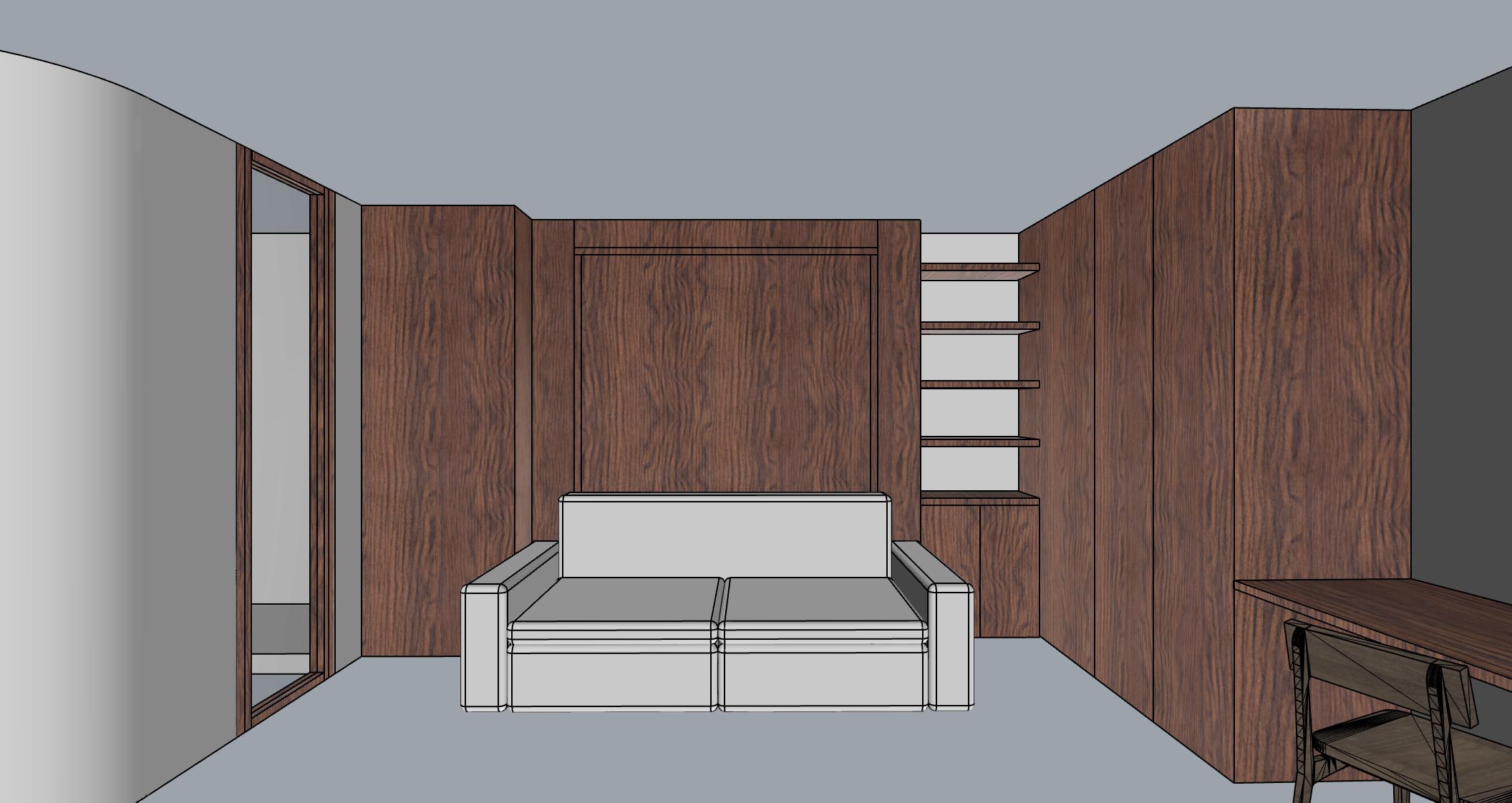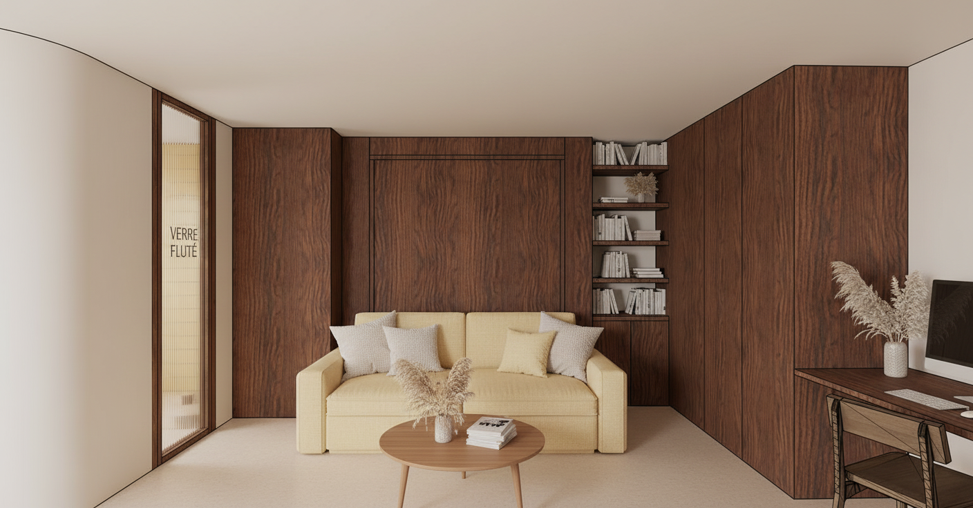 the image has to be very bright but no sunbeams or windows are visible the flooring has to be an light beige linoleum the sofa in the middle has to have a confy fabric in light yellow put some additional pillows on the left we have a wooden glass door that contains verre flut as we say in french through glass we see blurred light yellow tiles white joints in front of the sofa i want a round coffee table in wood scandinavian style and stages the walls can be creamy color i want books on the shelving and i want a computer in front of the chair on the right half out of view but some plants on table and shelves but not green more minimal dead plants make the render realistic so no 3d lines of the original image visible