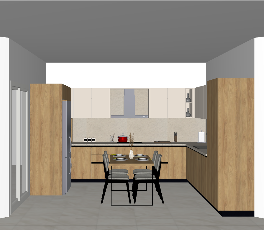create a beautifully rendered modern kitchen interior use warm oak wood textures for the cabinetry soft beige for the walls to create a cozy and inviting atmosphere incorporate a sleek gray stone countertop apply a contemporary light gray for the floor tiles include a polished stainless steel refrigerator for a sophisticated touch position a simple elegant dining table set with charcoal gray chairs and white tableware add a touch of color with a vibrant red pot on the stovetop ensure soft ambient lighting to enhance the inviting mood casting gentle shadows and highlights across the room